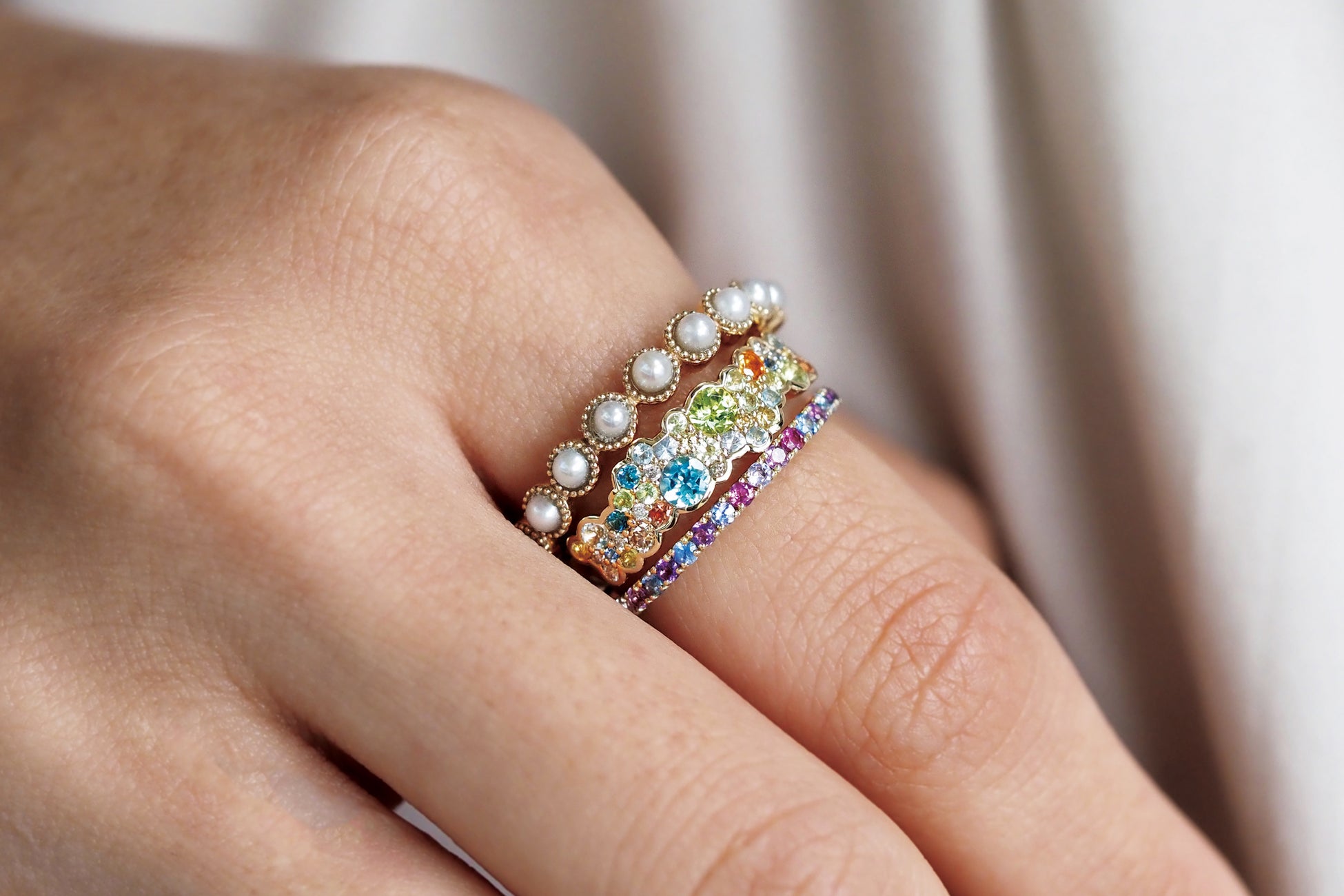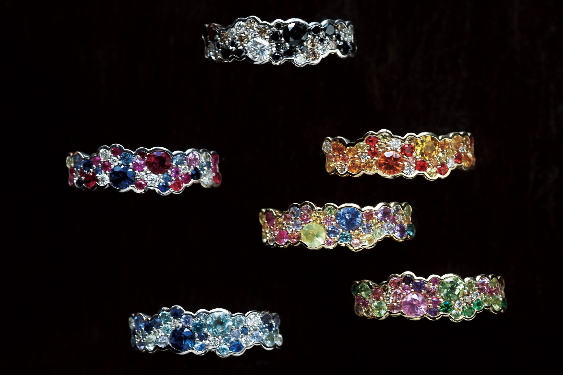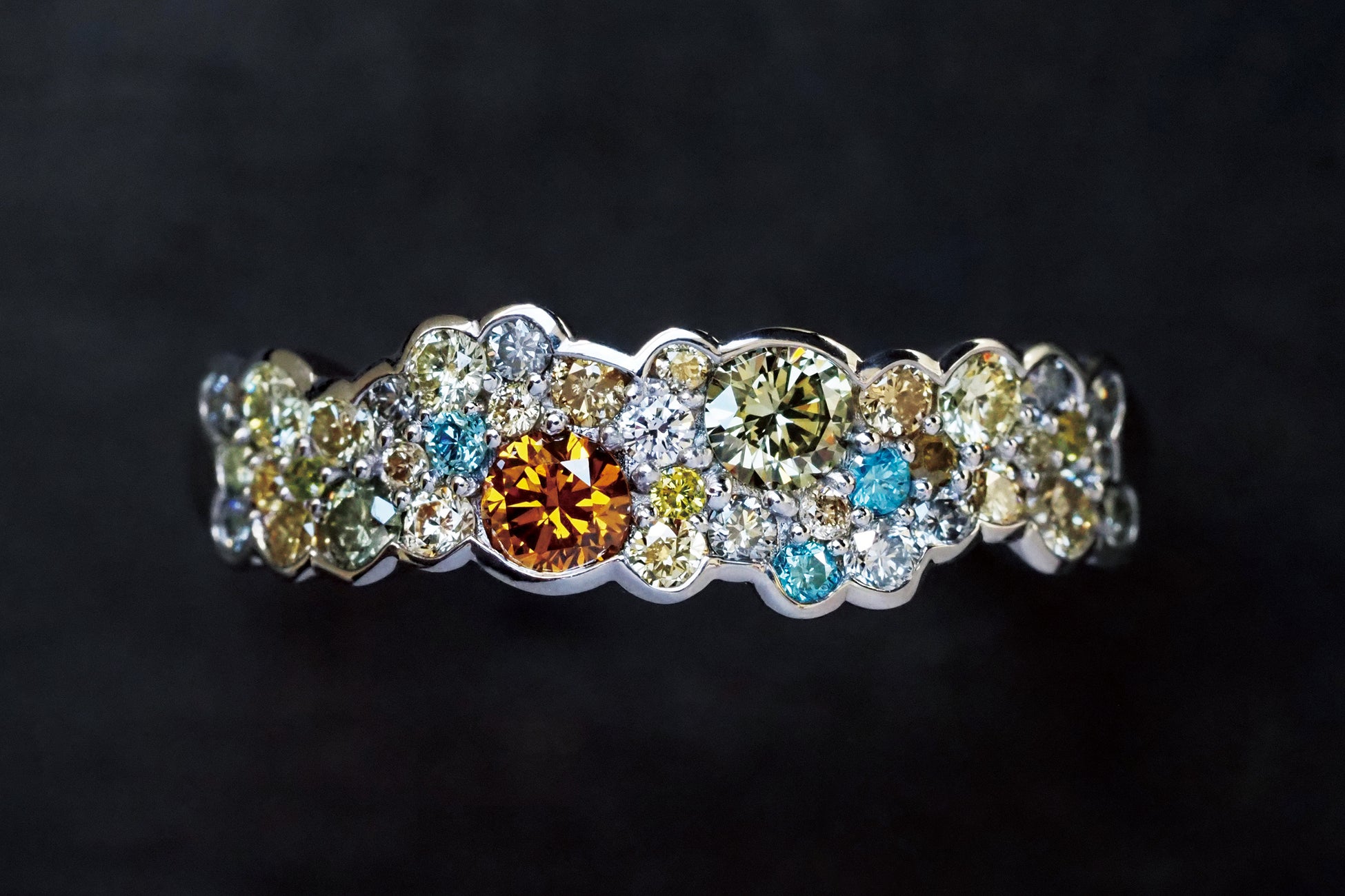 異なるサイズ・種類のカラーストーンとダイヤモンドを組み合わせ、極小の爪で隙間なく密に敷き詰めたパヴェ技法を採用しています。