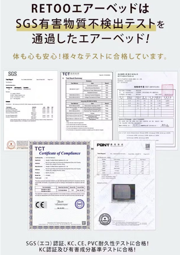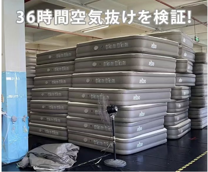 さらにRETOOのエアベッドは36時間の空気抜け耐久テスト、SGS有害物質不検出テスト