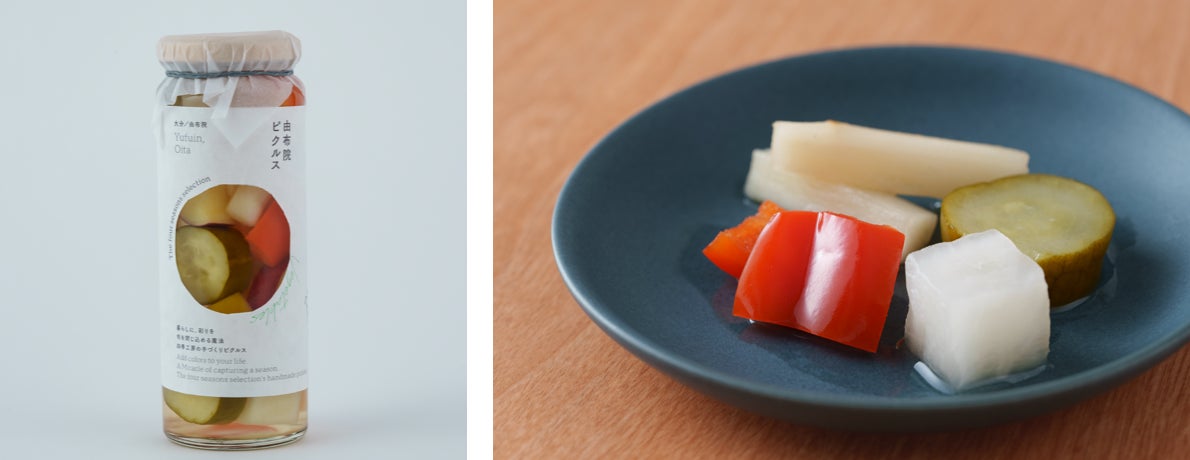 大分県の中央に位置する由布院は、人やモノが行き交う場所。そのハブ的な地域で<草庵秋桜四季工房>が製造するピクルスは、ご近所とのつながりで成り立っています。「由布院」という地名が付くことでそのエリアを背負うことになると考えて名付けられたこの商品は、生産者のバックボーンやこれまで積み上げてきた文化という物語を紡ぐ語り部として、また、消費者とのハブとして、その輪を未来に広げていきます。