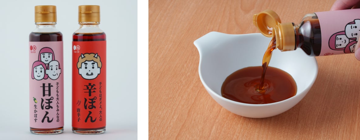 創業以来、オリジナルの味を追求するために、全工程を自社で行う一貫製造体制を構築する<マルマタしょう油>は、既存商品の「⽢ぽん酢」をリパッケージした「⽢ぽん」と新登場した「⾟ぽん」の少量サイズを発売します。「甘ぽん」は、酸味が苦手な方やお子さまにもやさしい味と、旨みの強さが特徴の一品で、大分県の特産品である生カボスを使用しています。また、今回、辛めが好みの方向けに「甘ぽん」にラー油やトウガラシを加えた「辛ぽん」も新たにご用意しました。