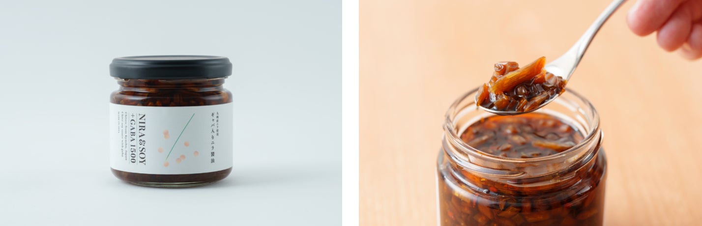これまで廃棄していたニラの茎を活用した「ニラ醤油」は、2019年の誕生以来、人気を博してきました。今回新たに登場する「ギャバ入りニラ醤油」は、大分県産の麦焼酎「いいちこ」(三和酒類)の製造過程でできる大麦の搾りかすから偶然発見されたGABAを「ニラ醤油」に加えたもの。味、栄養がさらに豊かになったアップサイクル調味料が誕生しました。