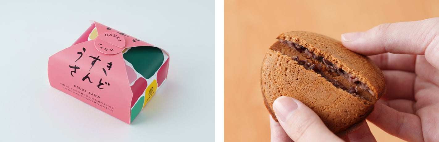 臼杵市がかつて生姜の一大産地だったことから、生姜の味付けを加えて地元の味として定着してきた「うすきせんべい」。生姜と砂糖を合わせた蜜を、はけで一つひとつ丁寧に手塗りし、地元の素材と手仕事の美しさをかけ合わせて生まれた臼杵ならではの味です。そのせんべいの間に小倉餡をサンドし、従来の固い「うすきせんべい」をやわらかくアレンジした商品がこちら。100年以上続く企業として、ヒトや企業、地元の素材などさまざまなものを「さんど」していきたいという想いが込められています。