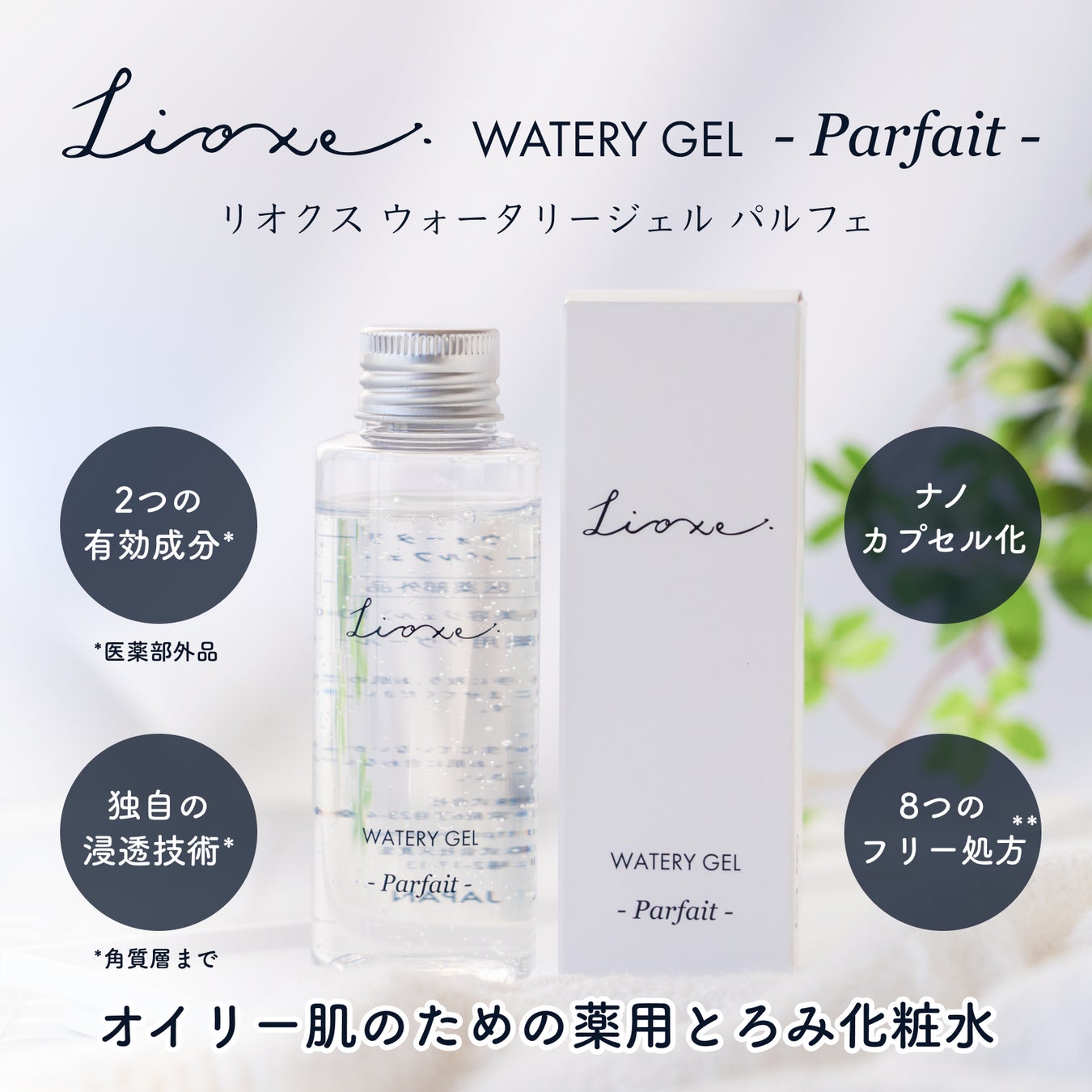 オイリー肌のことを考え、とことん寄り添ったオイリー肌のための化粧水「Lioxe WATERY GEL -Parfait-」の主な特徴は下記の4点です。