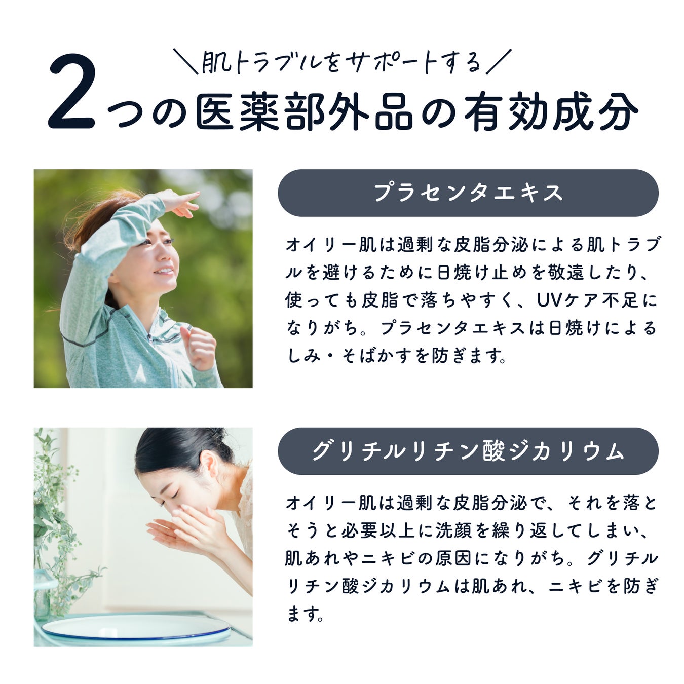 医薬部外品の有効成分「プラセンタエキス」「グリチルリチン酸ジカリウム」配合でオイリー肌に多い肌トラブルをサポート