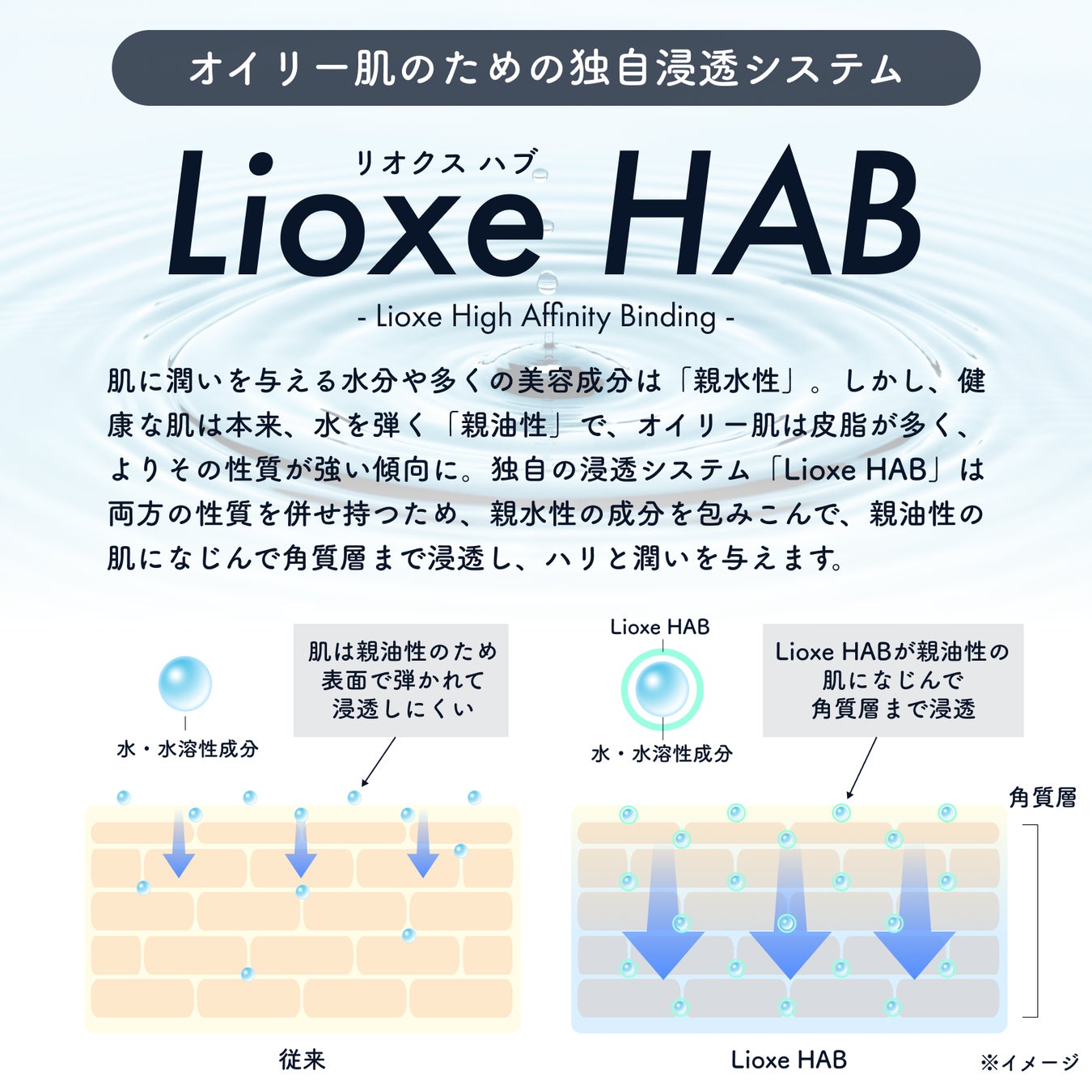 水を弾きやすいオイリー肌にも馴染んで浸透しやすい*独自技術の「Lioxe HAB」
