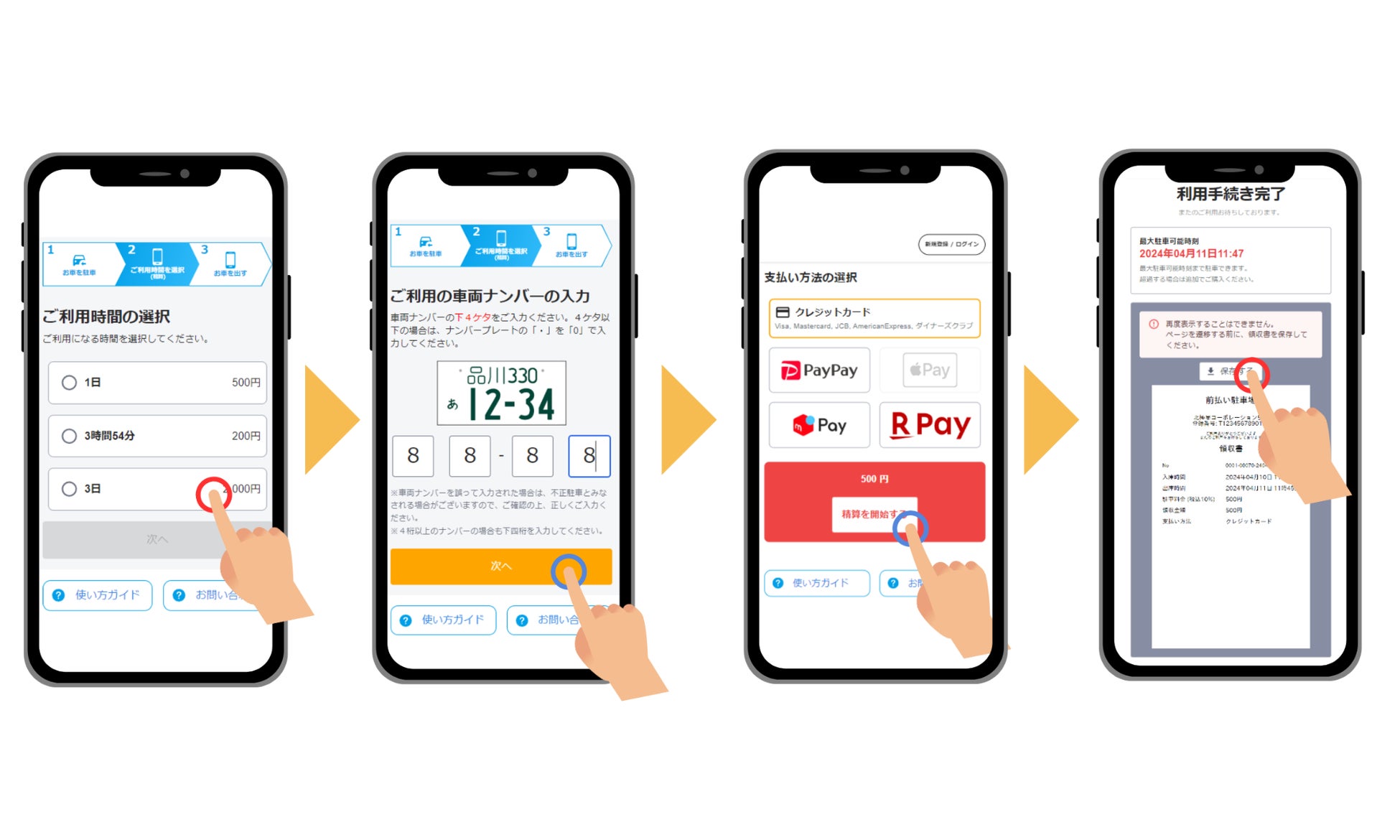 駐車場ユーザー様は、専用アプリ登録や会員登録をすることなく、駐車場内の看板に掲示されたQRコードを読み込んでWeb上で操作を行います。