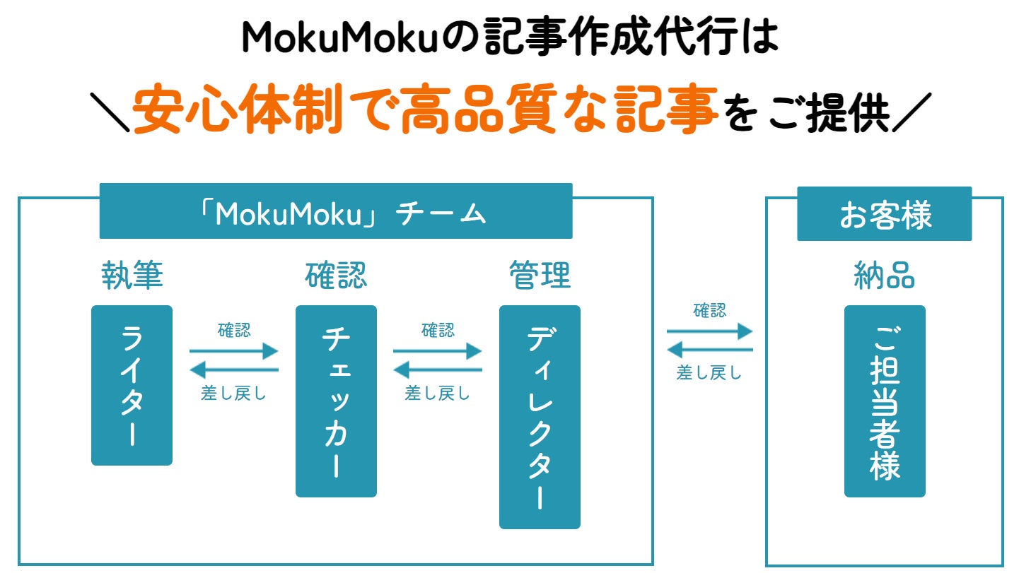 記事作成サービス「MokuMoku」は、チーム体制で品質と納期を第一優先に記事作成を代行します。