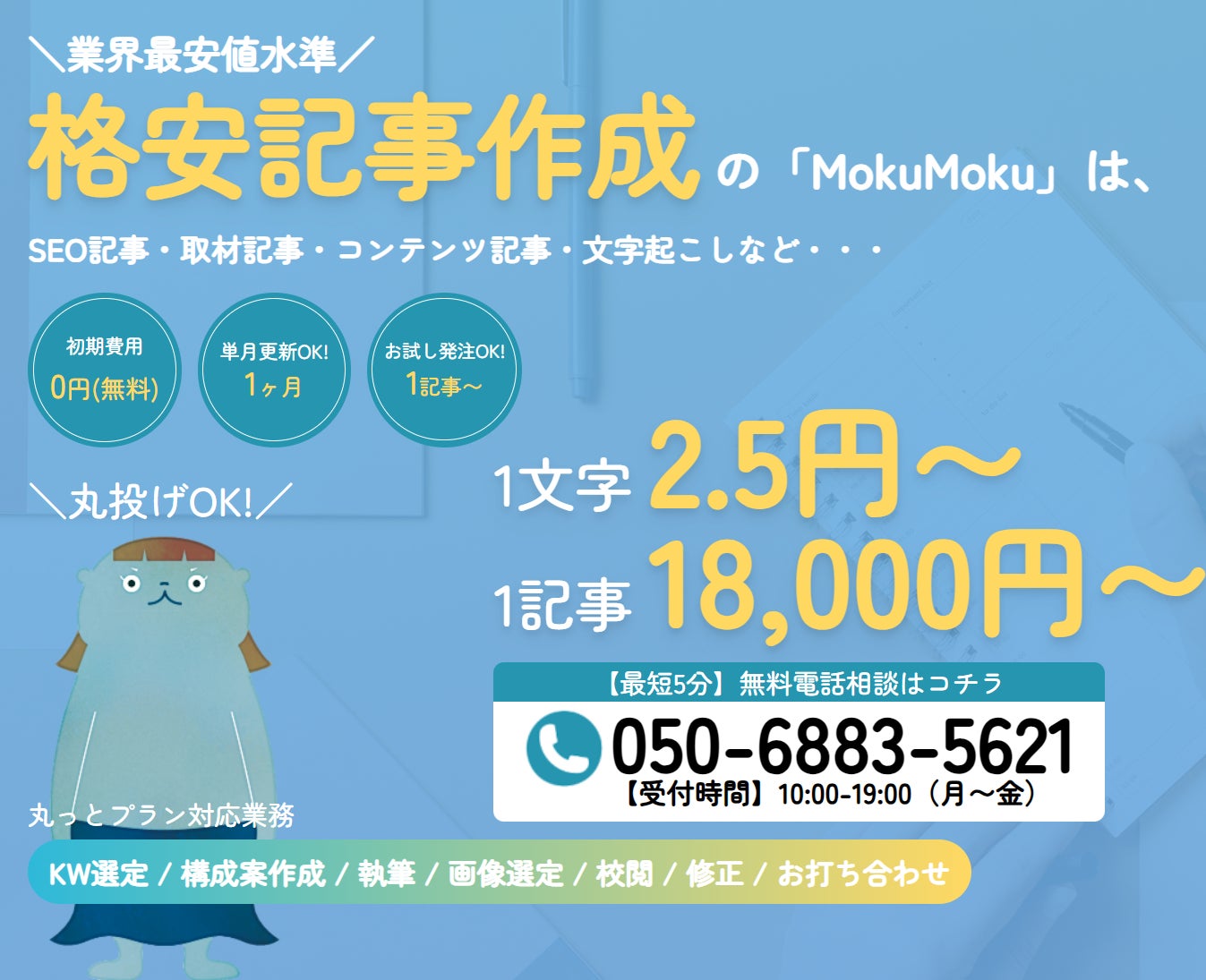 1文字2.5円、1記事18,000円の業界最安値水準