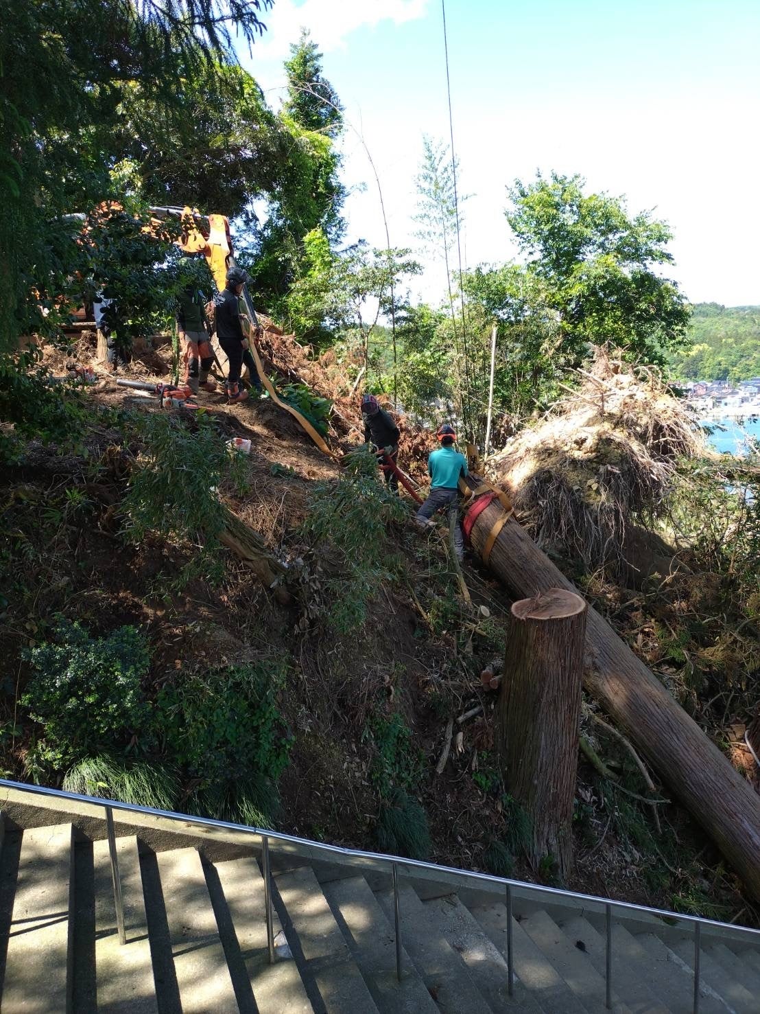 参道の斜面に根元から倒れていた、2本の杉の大木を重機で引き上げる作業が始まりました。