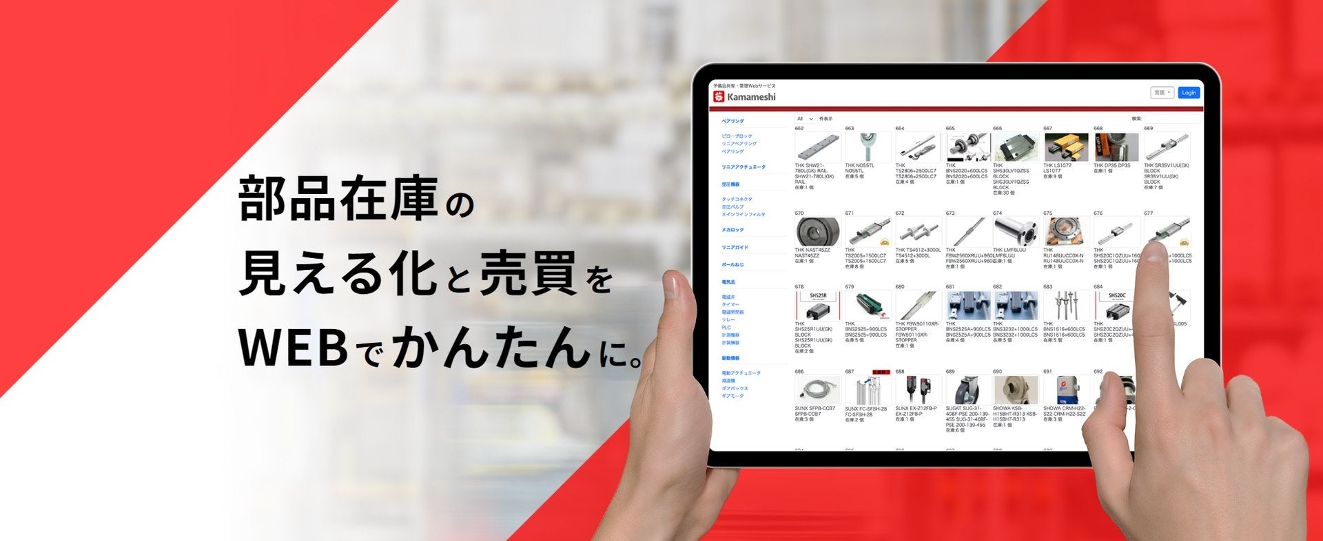 「Kamameshi」は、中小製造業向けの設備部品管理・マッチングプラットフォームです。部品在庫管理のDXを実現しリスクの見える化をした上で、会員間で必要な部品をスムーズに融通し合うことができる場を提供します。