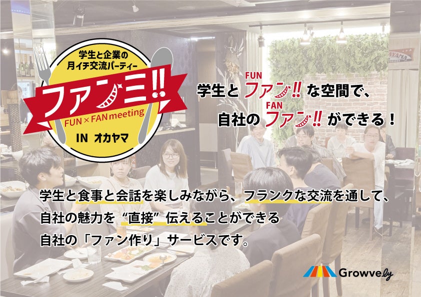 新卒採用のコンサルティングを行う株式会社Growvely(代表取締役:井口陽平、本社:岡山県岡山市)は、令和6年4月より、地方中小企業の新卒採用に向けた学生の母集団形成サービス「ファンミ!!」の提供を開始します。学生と食事と会話を楽しみながら、フランクな交流を通して自社の魅力を直接伝えることで、関係構築を元にした母集団形成をサポートします。
