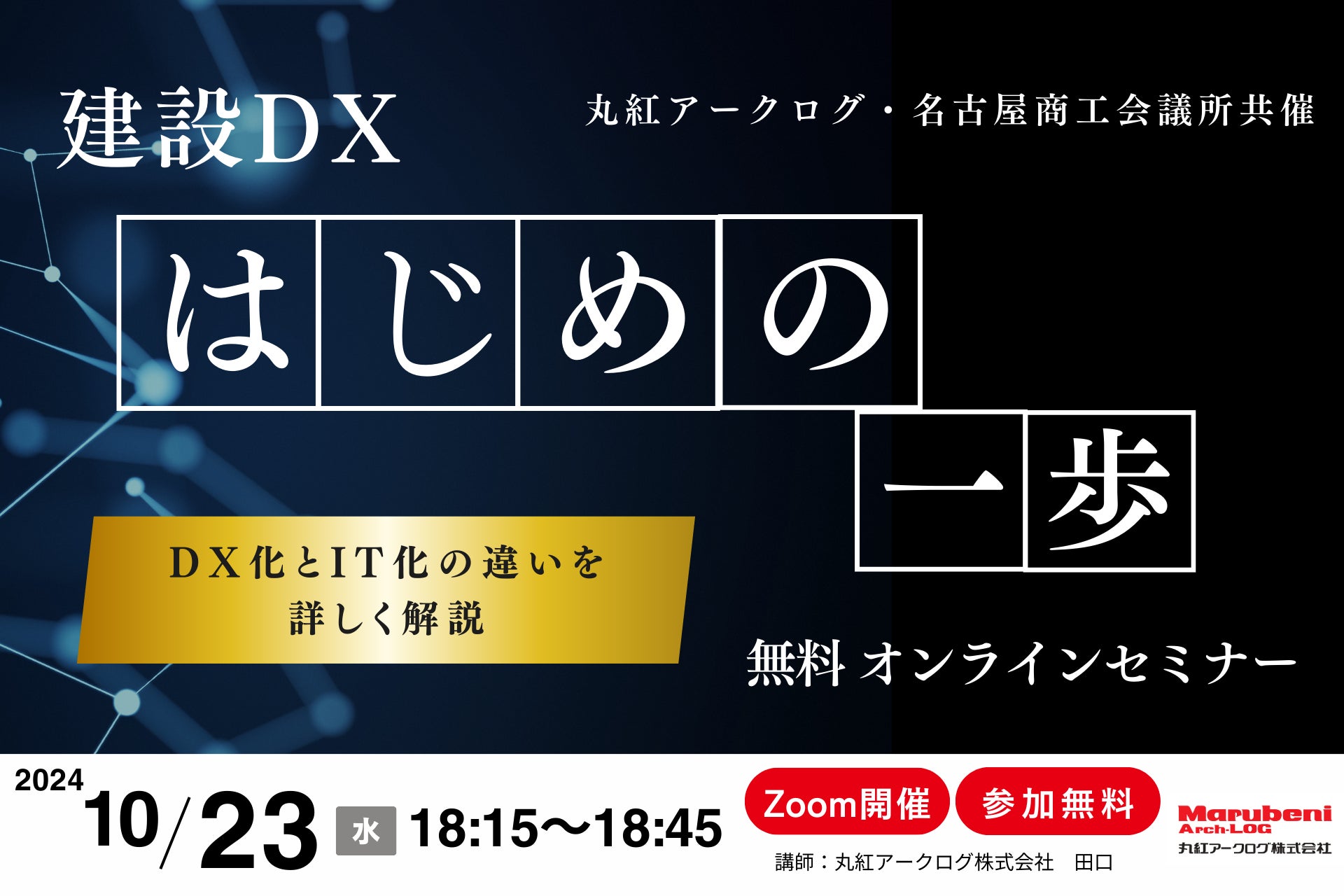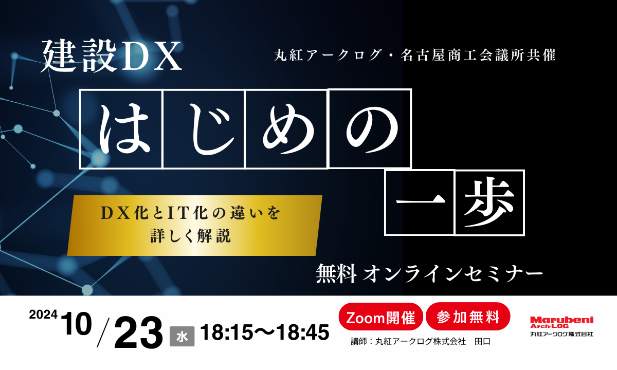 建設業界のためのデジタルデータプラットフォーム「Arch-LOG」を運営する丸紅アークログ株式会社(本社:東京都港区、代表取締役社長:井谷 嘉宏、以下:丸紅アークログ)は、2024年10月23日に名古屋商工会議所との共催で、無料オンラインセミナーを開催いたします。名古屋市内の企業だけでなく地域問わず参加可能です。