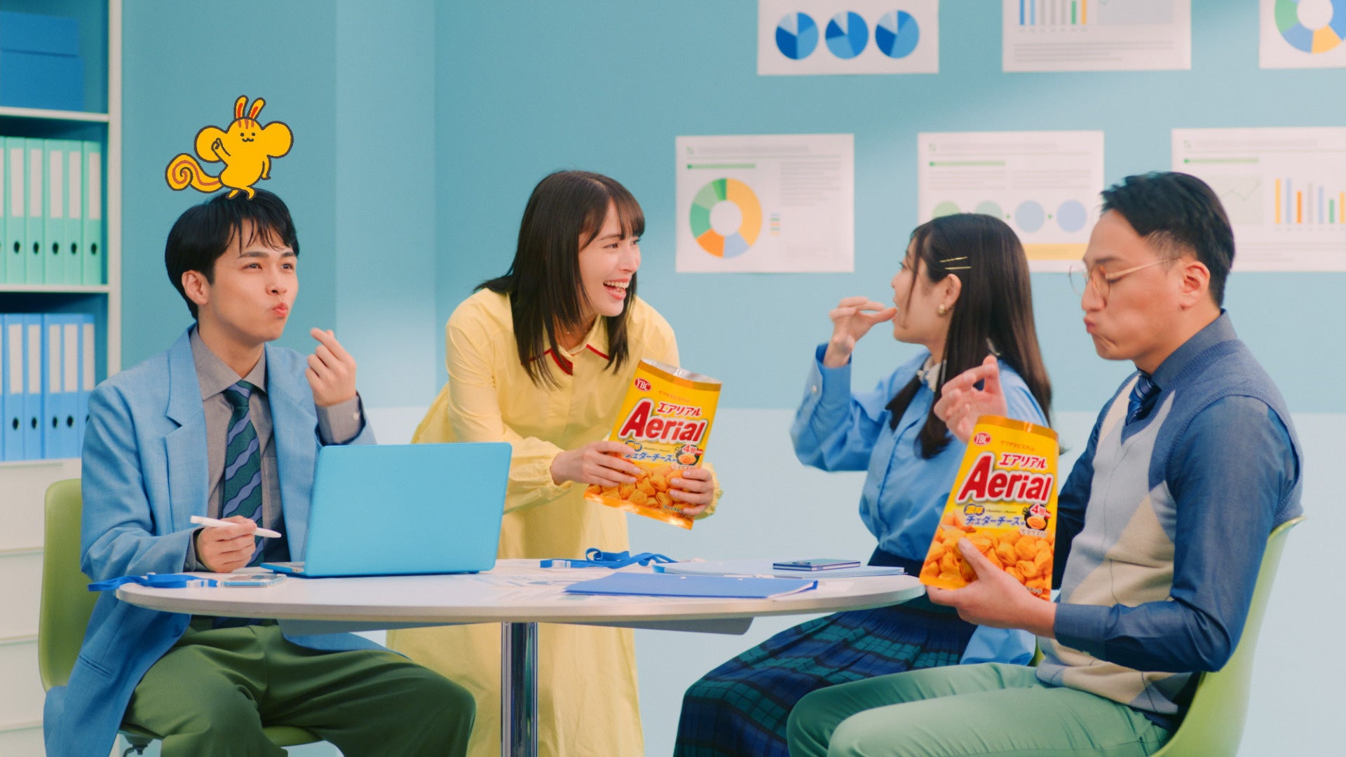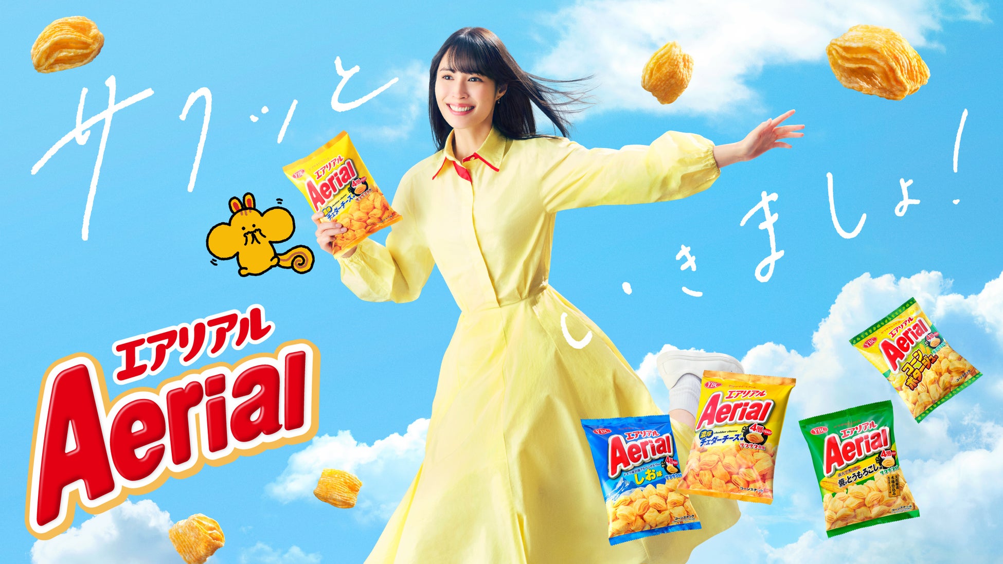 4層構造によるサクサク食感が人気のコーンスナック「エアリアル」は今年発売15周年を迎えます。食べたら分かる独特の軽い食感は、心も体も軽くなる? そんなエアリアルのファンであり、2019年以来エアリアルのCMに出演いただいている広瀬アリスさんが、「15周年盛り上げ隊長」として、エアリアルをサクサクと頬張る姿は必見です。隊長の勢いは止まらず、WEB限定動画「#サクッと盛り上げ15連発」にも挑戦します。その中で、広瀬さんが自ら新たに誕生させたマスコットキャラクター「エアリッス」との、かわいらしい掛け合いが微笑ましいテレビCMが完成になっています。2024年8月からは広瀬アリスさんがプロデュースした「わさび味」の発売に合わせて、「みんなでサクッと」篇が新たに公開されます。