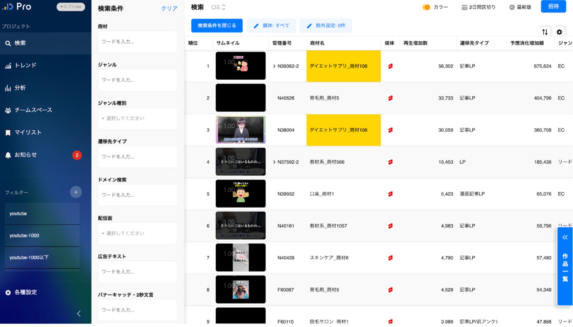この機能を使用することで、現在売れている広告クリエイティブや案件、また市場のトレンドをいち早く見つけることができます。