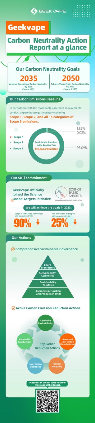 7月25日、Geekvapeは初のカーボンニュートラリティアクションレポート(以下「アクションレポート」)を正式に発表し、2035年までに事業運営でのカーボンニュートラルを、2050年までにバリューチェーン全体でのカーボンニュートラルを達成することを約束しました。さらに、Geekvapeは6月20日にScience Based Targets initiative(SBTi)に正式に参加し、世界初の非上場のベープ業界企業としてSBTiに加入しました。これは、Geekvapeが世界的な気候変動対策に取り組み、業界の長期的なグリーンおよび低炭素開発を推進することへのコミットメントを示しています。