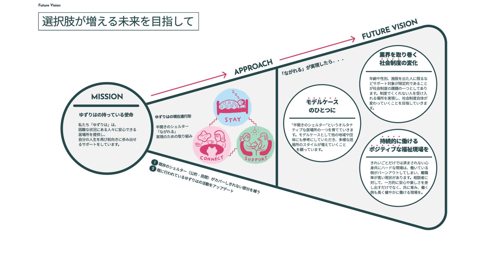 このような背景を踏まえ、このたび設立予定の「ながれる」は、施設の個室に閉じこもらず、他者や街の気配を感じながら心地よく過ごせることをコンセプトの中心に据えています。身の安全確保を最優先する既存のシェルターも当然必要ですが、サポートを必要とする人のバックグラウンドが多様であるからこそ、“半開き”のシェルターが多様な選択肢のひとつとなることを目指します。