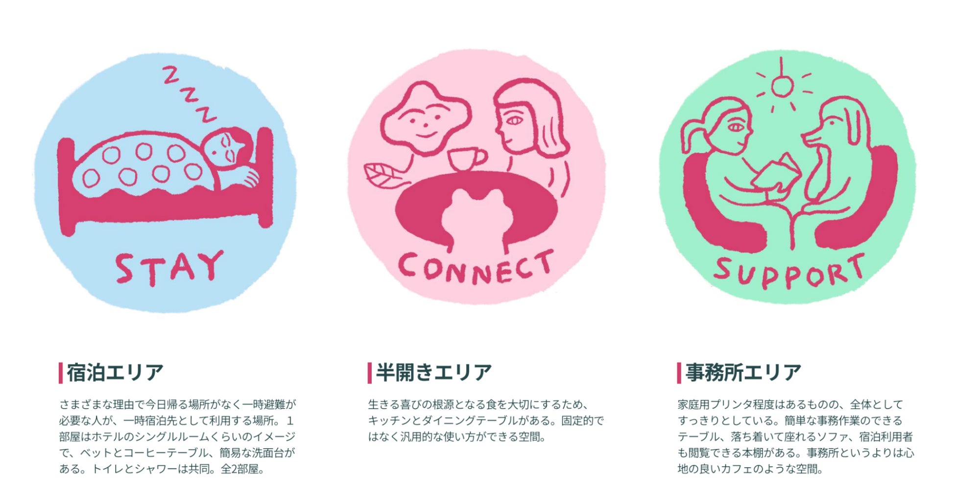 シェルター(最大2名宿泊)/相談・事務スペース/コミュニティ(半開き)スペース