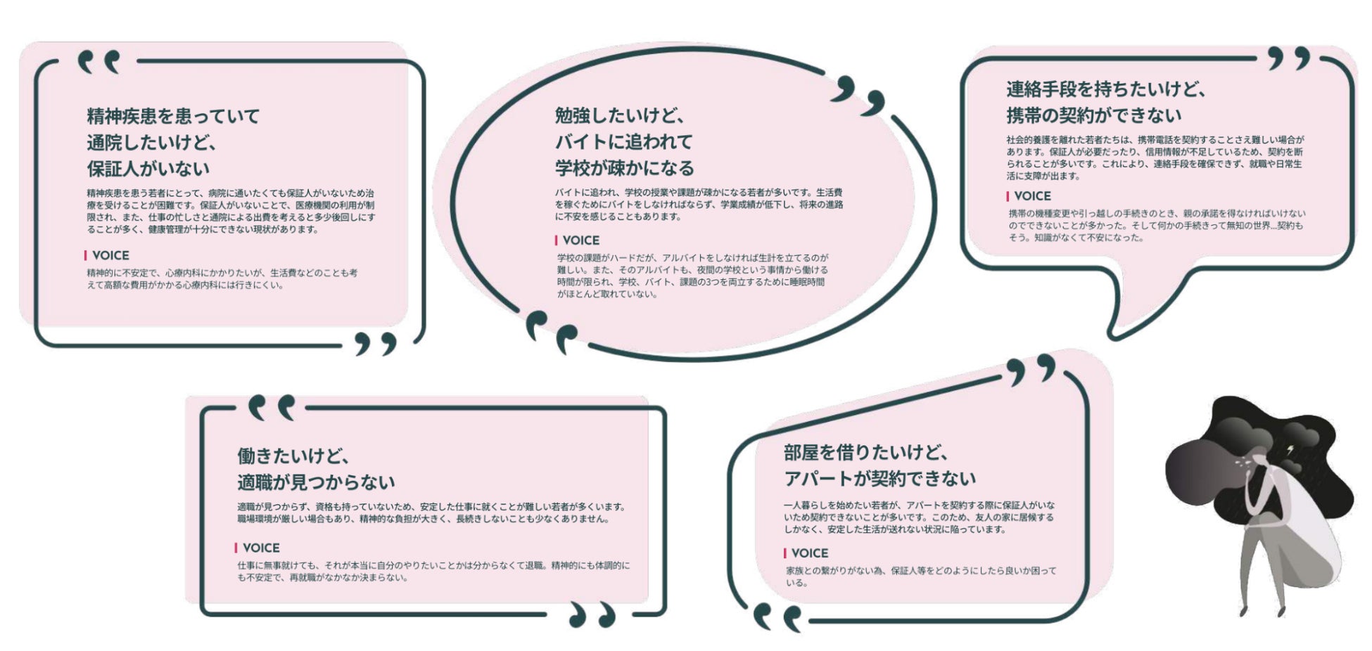 幼少期のトラウマ、保証人がおらず住居を借りられない問題、借金、家族やパートナーからの暴力、予期せぬ妊娠など、一人で対応していくには困難な課題を、共に考え、整理し、手続きするサポートを実施しています。その他、国分寺市の拠点を活用した気軽に集えるサロン、一緒に働く「ゆずりは工房」でのジャム製造・販売、高卒認定資格取得に向けた無料学習会、虐待に至ってしまった親への「MY TREE ペアレンツ・プログラム」などを行っています。