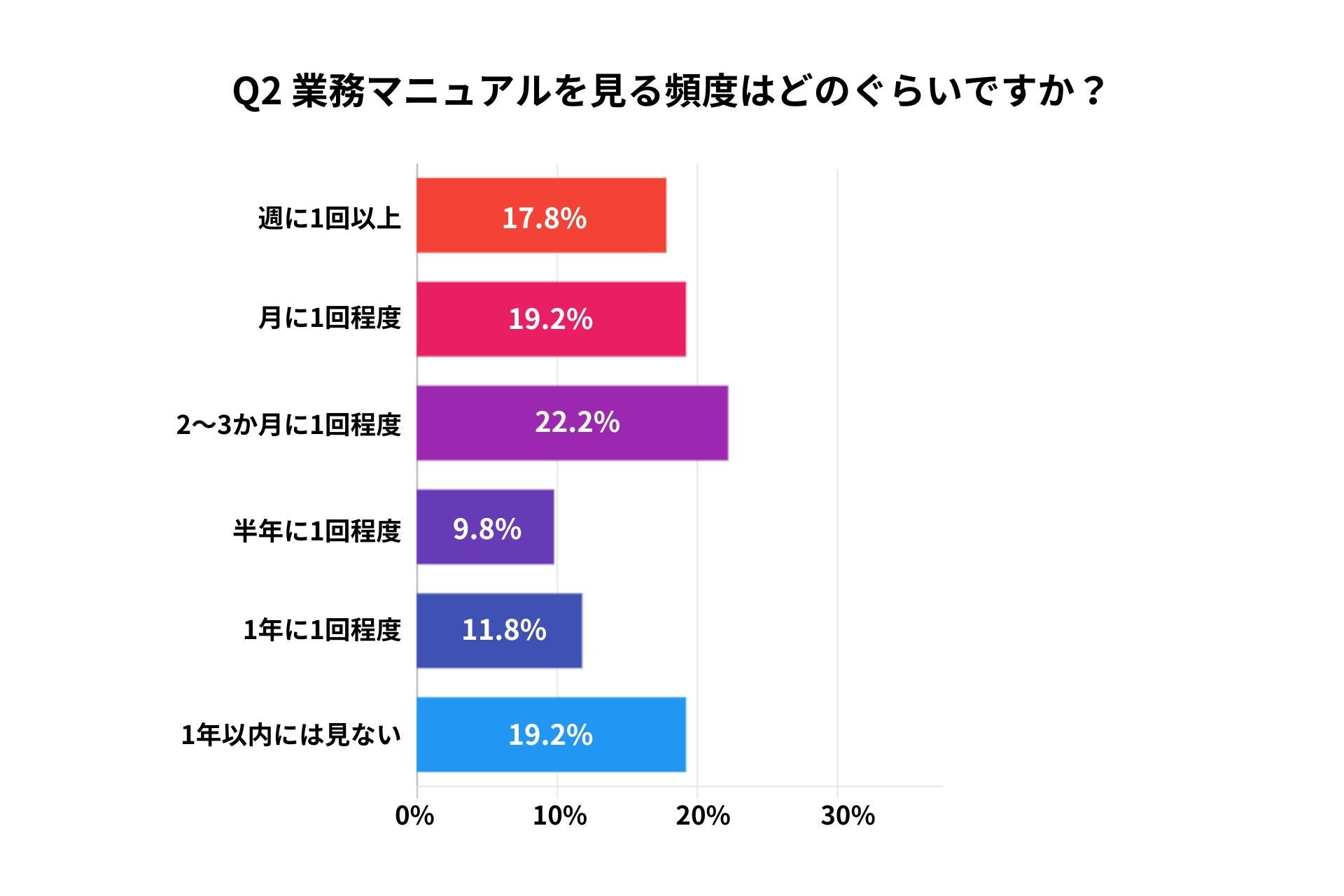 業務マニュアルを見る頻度は「2~3か月に1回程度(22.2%)」が最も多い回答となりました。次いで「月に1回程度(19.2%)」、同率で「1年以内には見ない(19.2%)」ということが判明しました。