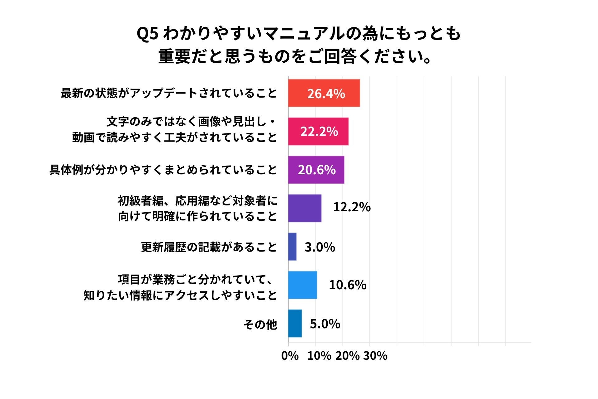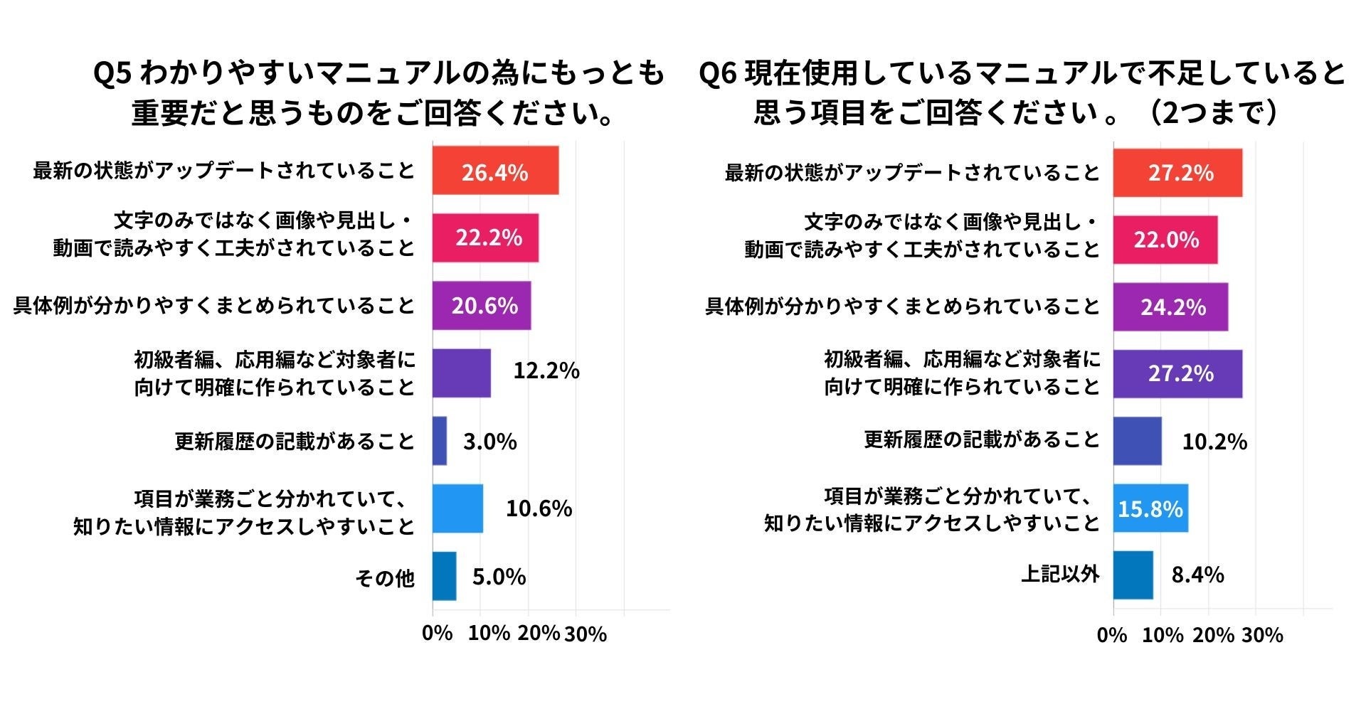 業務マニュアルには、「最新の状態がアップデートされていること(26.4%)」、「文字のみではなく画像や見出し・動画で読みやすく工夫がされていること(22.2%)」、「具体例が分かりやすくまとめられていること(20.6%)」が求められていることがわかりました。