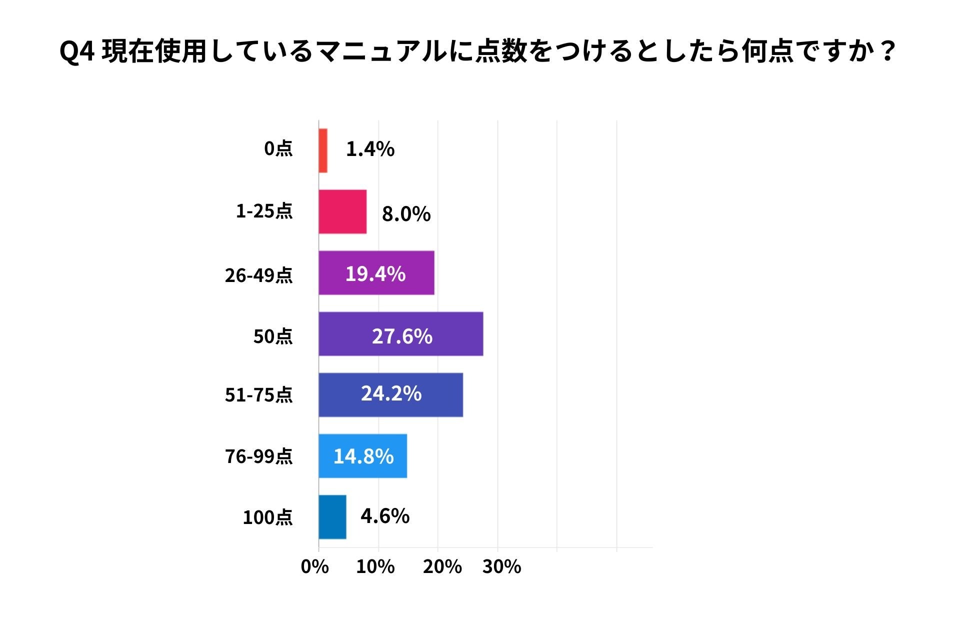 現在使用している業務マニュアルに点数をつけると、「50点(27.6%)」が一番多く、次いで、「51~75点(24.2%)」でした。