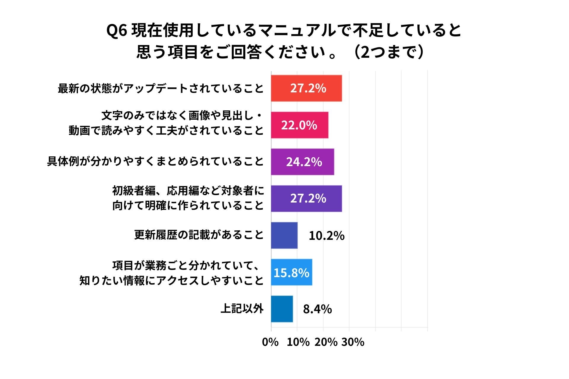 「最新の状態がアップデートされていること(27.2%)」「初級者編、応用編など対象者に向けて明確に作られていること(27.2%)」「具体例が分かりやすくまとめられていること(24.2%)」「文字のみではなく画像や見出し・動画で読みやすく工夫がされていること(22.0%)」がほとんど横並びの結果となりました。
