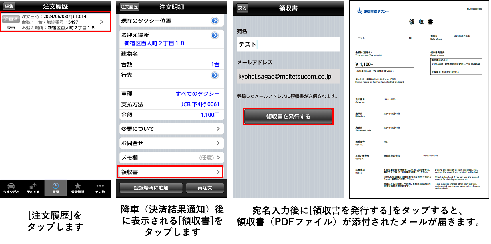 オンライン決済の場合、アプリ上の注文履歴から、PDF形式で電子領収書の発行が可能です。