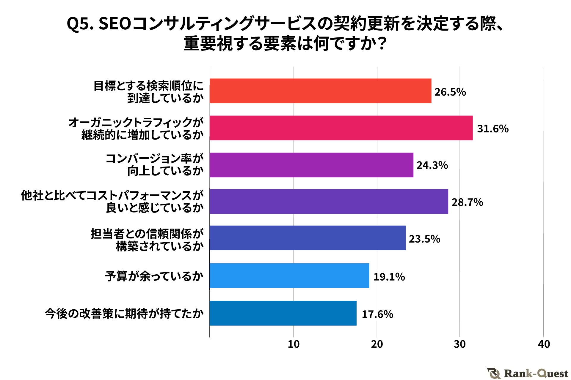 調査結果⑤ SEOコンサルティングサービスの契約更新を決定する際、重要視する要素は何ですか?