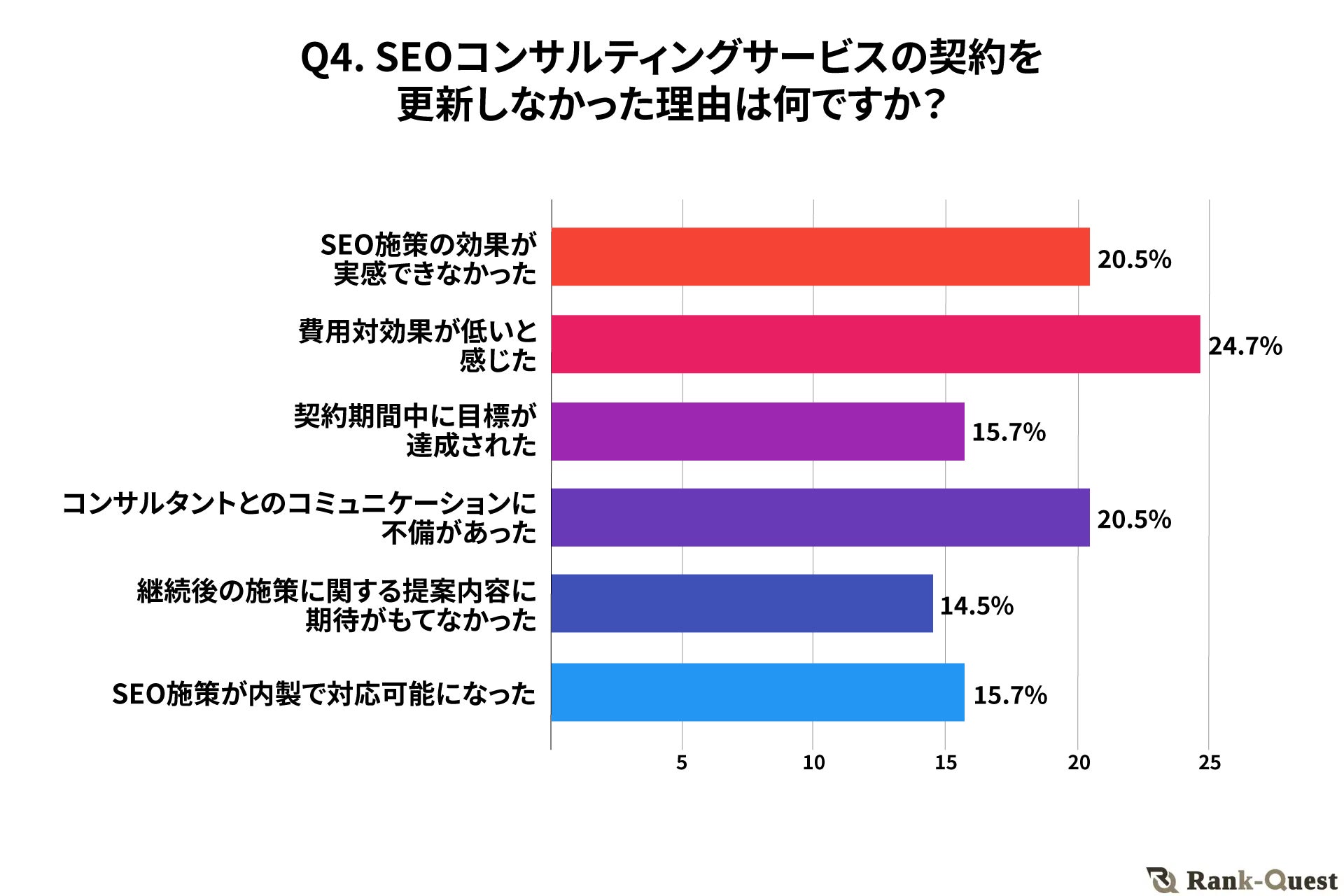 調査結果①で分かった「SEOコンサルティングサービスの契約を更新したことがない人」を対象に伺ったところ、最も多かった回答は「費用対効果が低いと感じた(24.7%)」でした。