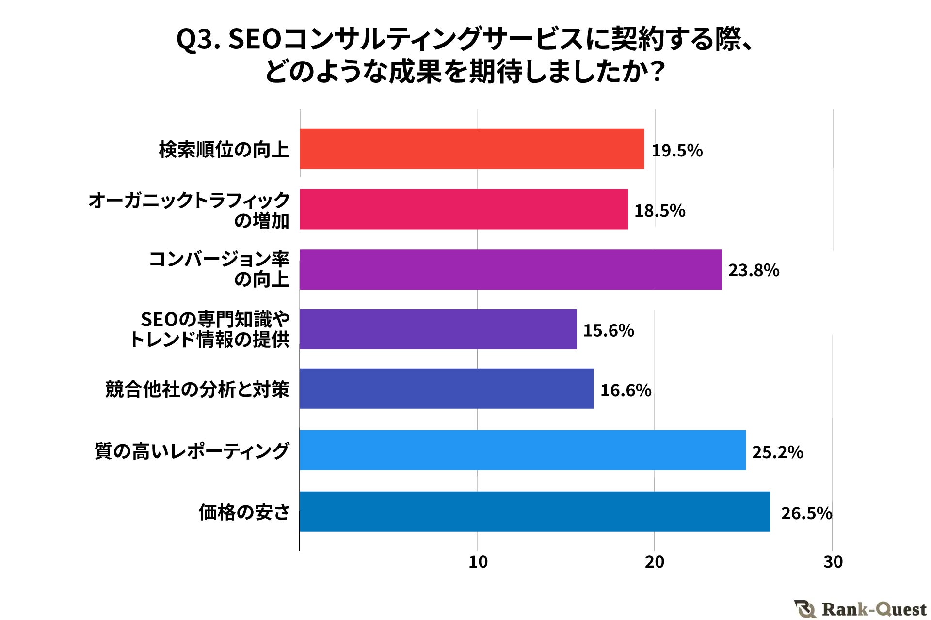 SEOコンサルティングサービスには、「価格の安さ(26.5%)」、「質の高いレポーティング(25.2%)」、「コンバージョン率の向上(23.8%)」が期待されていることが分かりました。