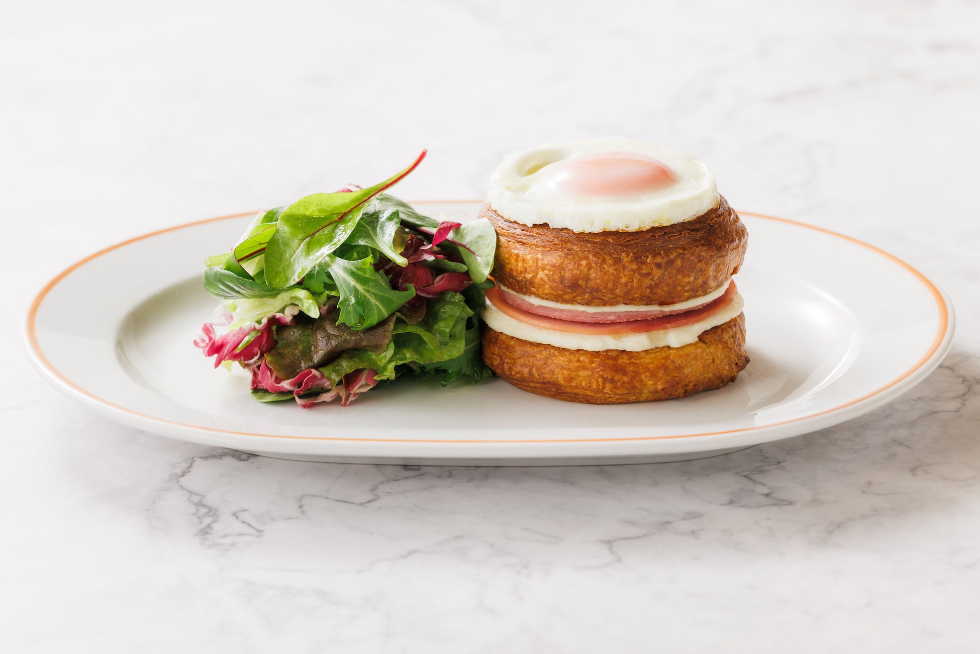 バター香るクロワッサンでベシャメルソ ース、ハム、チーズをサンドし、目玉焼き をのせたフランスの定番軽食メニュー。 サクサクのクロワッサンに濃厚なチーズ とベシャメルソースがベストマッチ。