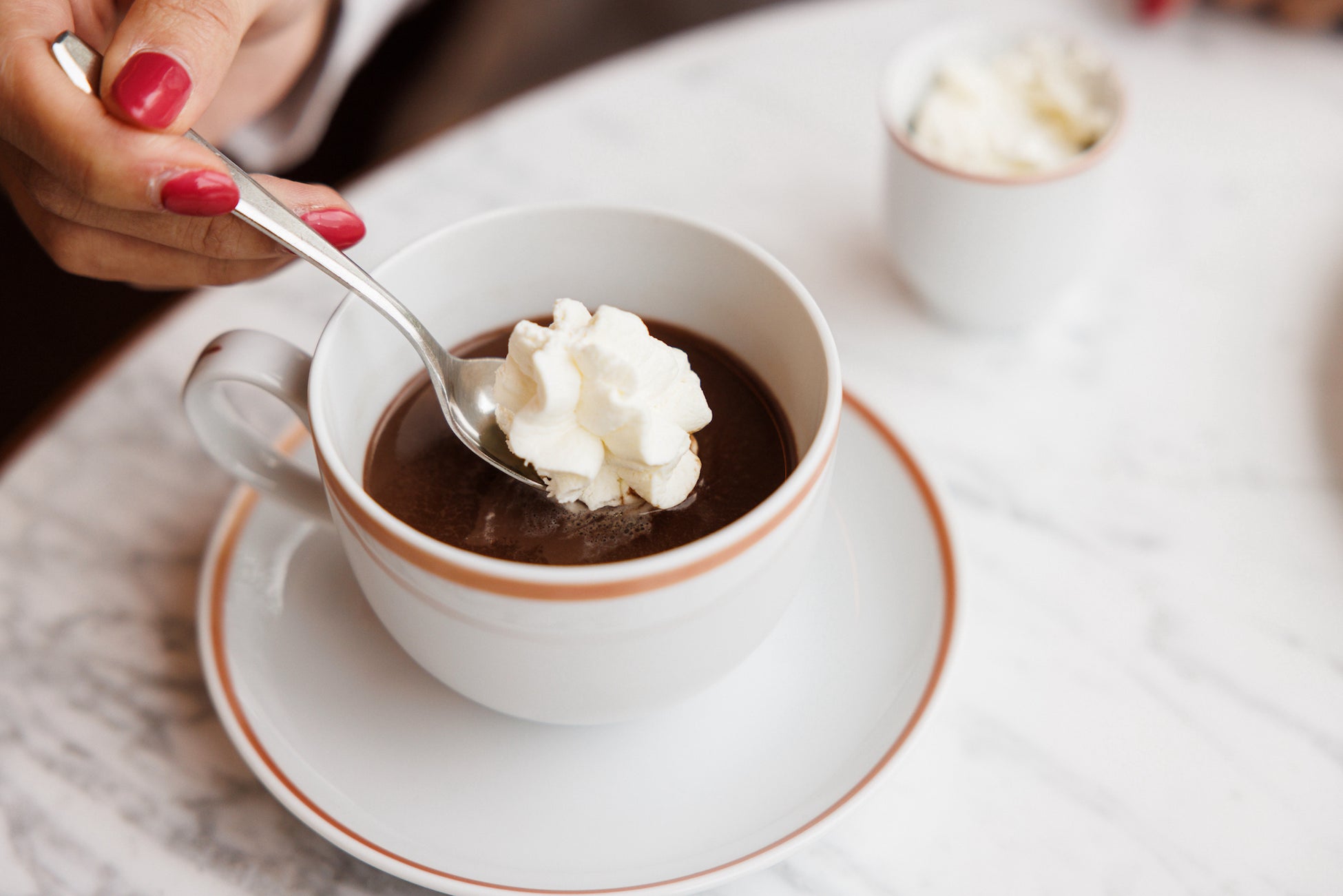 創業から受け継がれる濃厚なホットチョコレート。別添えのホイップクリームを溶かして「アンジェリーナ」の変わら ぬスタイルをお楽しみください。