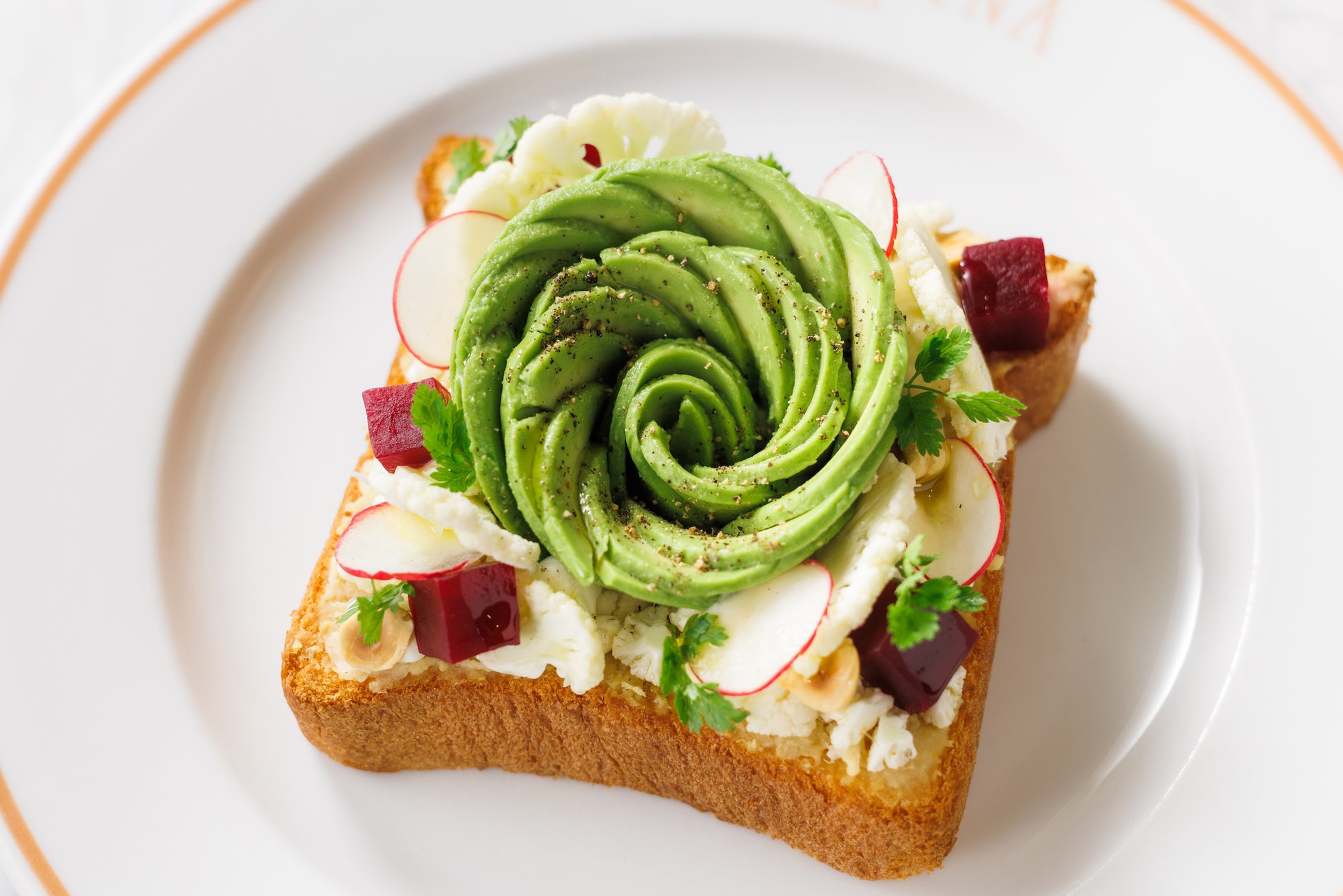 バターたっぷりのブリオッシュを使ったアボカドトースト。バターとパルメザンチーズの上にクリームチーズ、ひよこ豆のフムスを塗り、華やかなロザス(薔薇)仕立てのアボカドをトッピング。カリフラワー、ビーツ、ラディッシュ、パンプキンシードを散らしました。