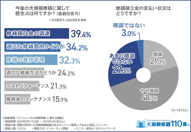 大規模修繕の大きな鍵となる資金調達では、約3割が「順調でない」と答えており、十分な予算がとれない現状が明らかになりました。