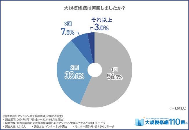 「大規模修繕は何回しましたか?」と質問したところ、『1回(56.5%)』と回答した方が最も多く、次いで『2回(33.0%)』と続きました。