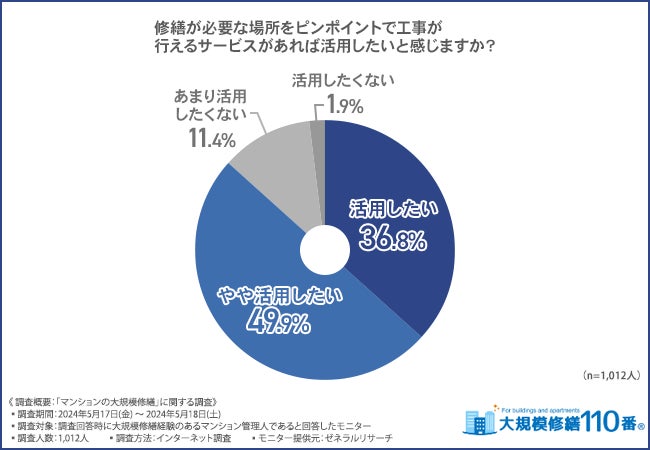 「修繕が必要な場所をピンポイントで工事が行えるサービスがあれば活用したいと感じますか?」と質問したところ、『活用したい(36.8%)』『やや活用したい(49.9%)』『あまり活用したくない(11.4%)』『活用したくない(1.9%)』という回答結果になりました。