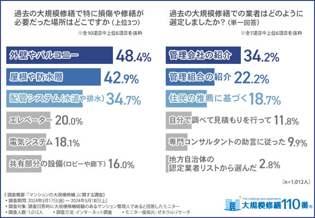 過去の大規模修繕についてうかがうと、特に修繕が必要だった箇所は、外壁やバルコニー、屋根など外気にさらされる部分や、雨風など自然環境の影響を受けやすい部分が重点的に修繕されているようです。また、業者選定方法としては、管理会社の紹介が約3割と最も多く、マンション管理の専門知識があり、経験も豊富な管理会社からの情報が重視されているようです。
