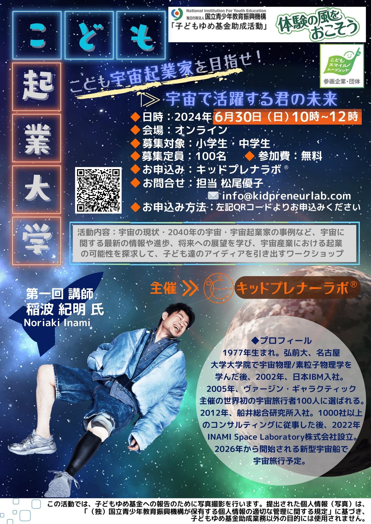 記念すべき第一回目のテーマは「宇宙」です。ゲスト講師には、世界初の宇宙旅行者100人に選ばれた稲波紀明氏をお迎えし、宇宙ビジネスの無限の可能性についてお話しいただきます。稲波氏の貴重な体験談とともに、子どもたちが宇宙への夢を広げる機会を提供します。