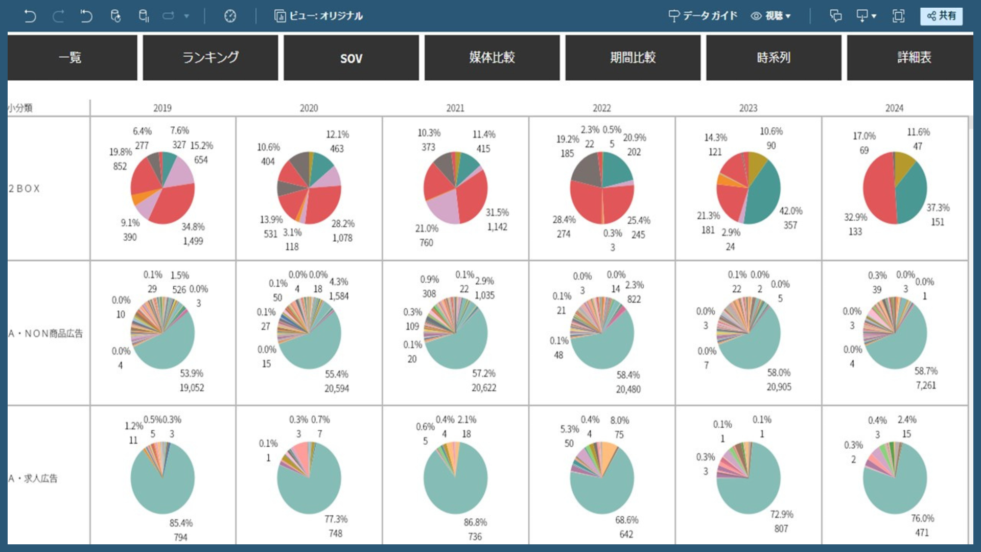 毎日発行される日本全国の新聞約1 万件、雑誌約2,000 件、2021 年からはテレビCM の広告情報も加わり、より充実した情報提供が可能となりました。そのデータ分析も統計解析を用いる広告効果の効率計算、さらには最適な広告マーケティング計画の立案へとNASのご利用の幅も広がっております。