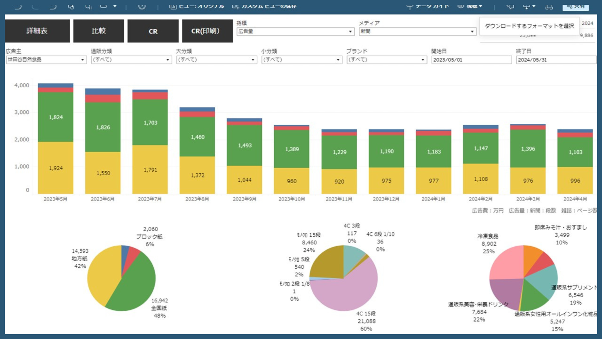 新聞・雑誌を全体から見たマクロ的な出稿傾向や、個別の地域、媒体などミクロ的な出稿状況を一覧できる機能です。