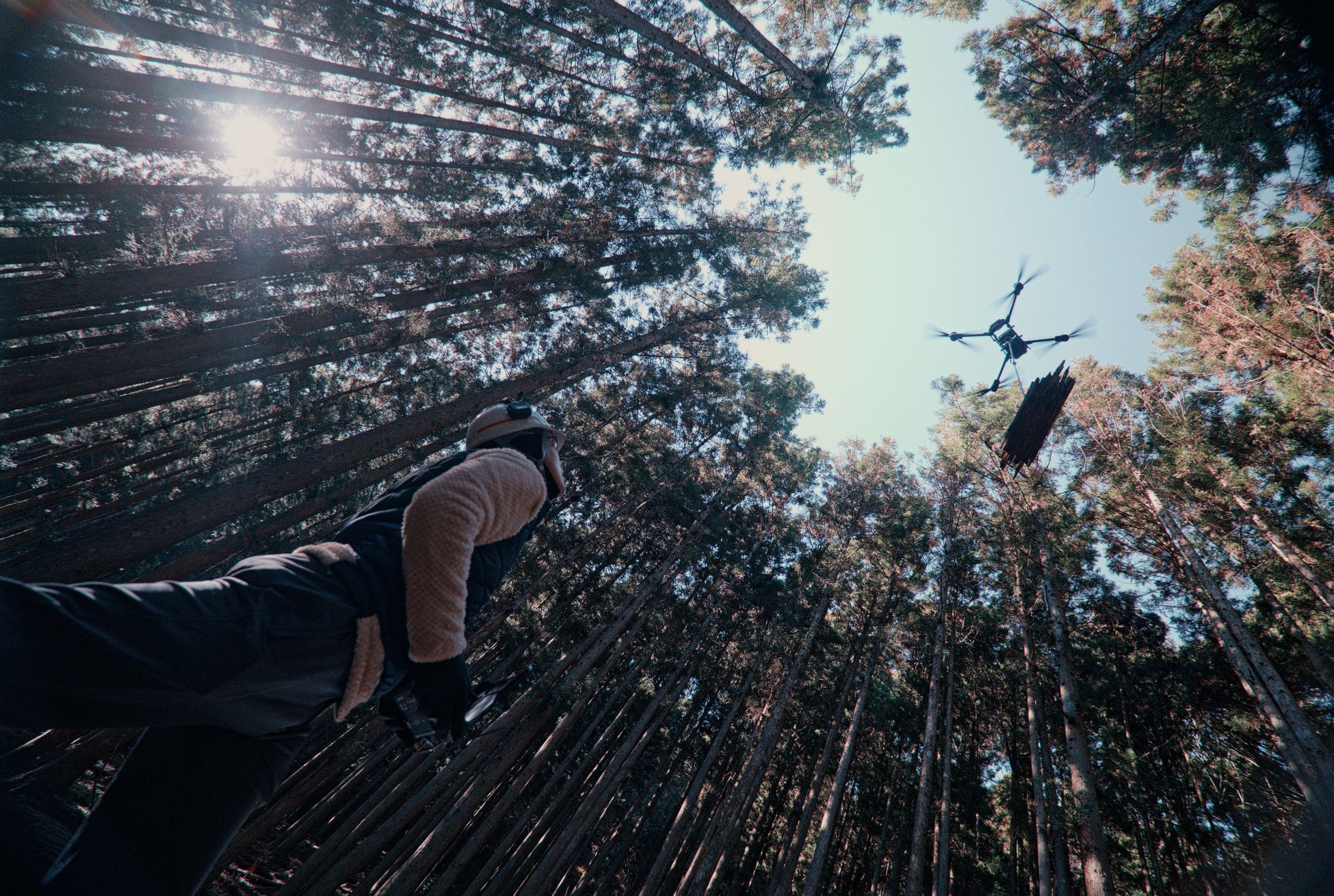 山間部でのドローン運搬作業を実施し、2日間で4.8tの廃材を運搬しました。