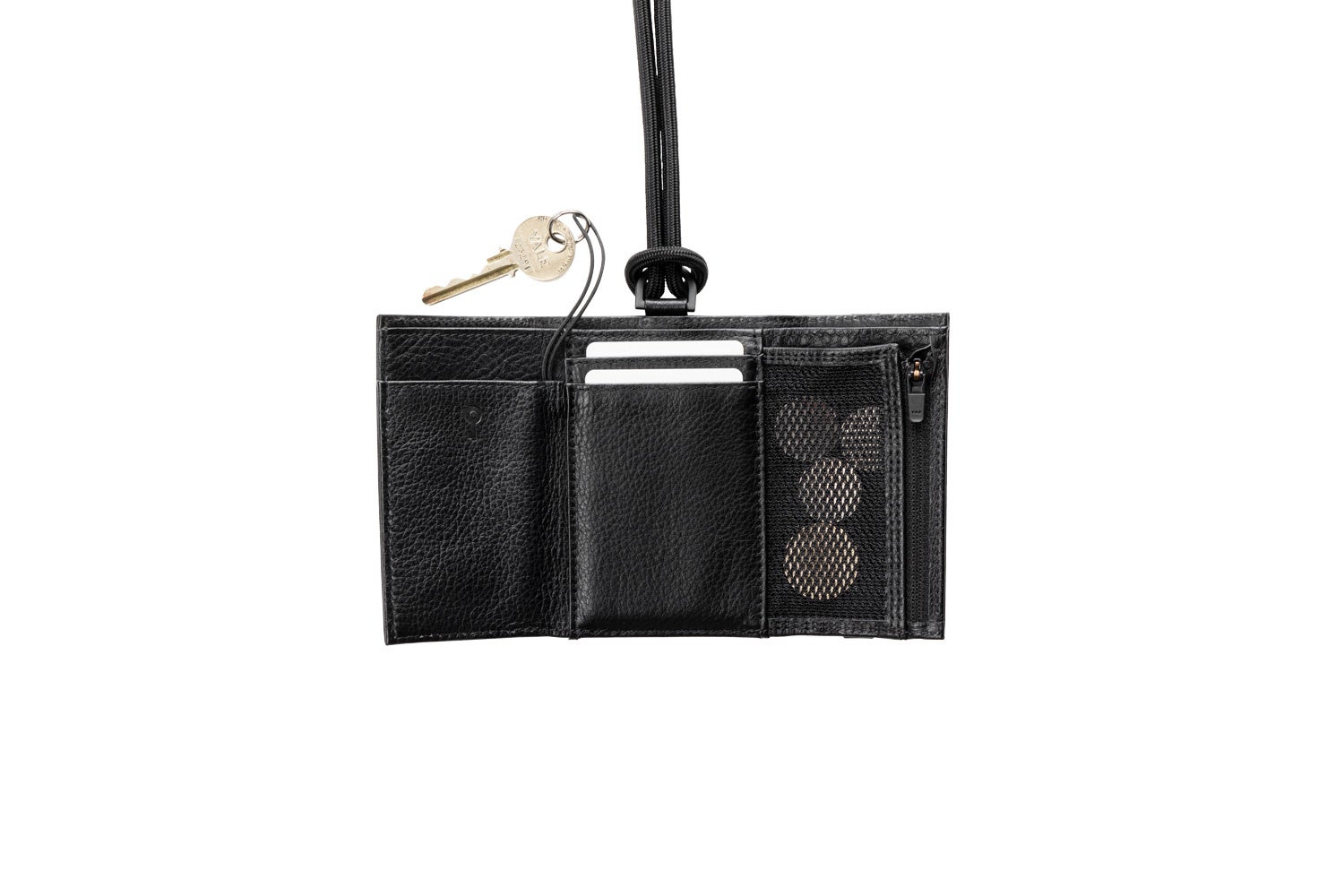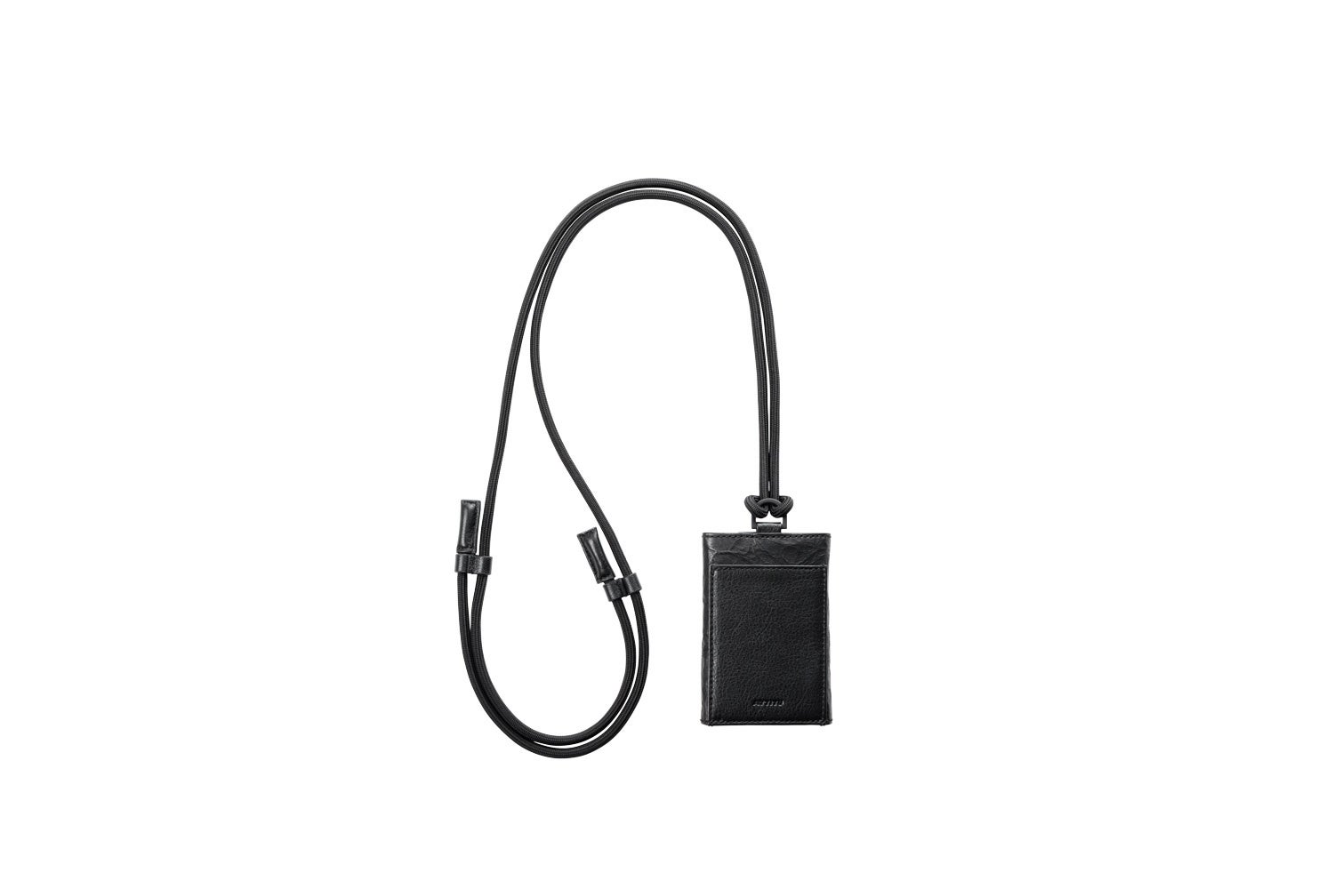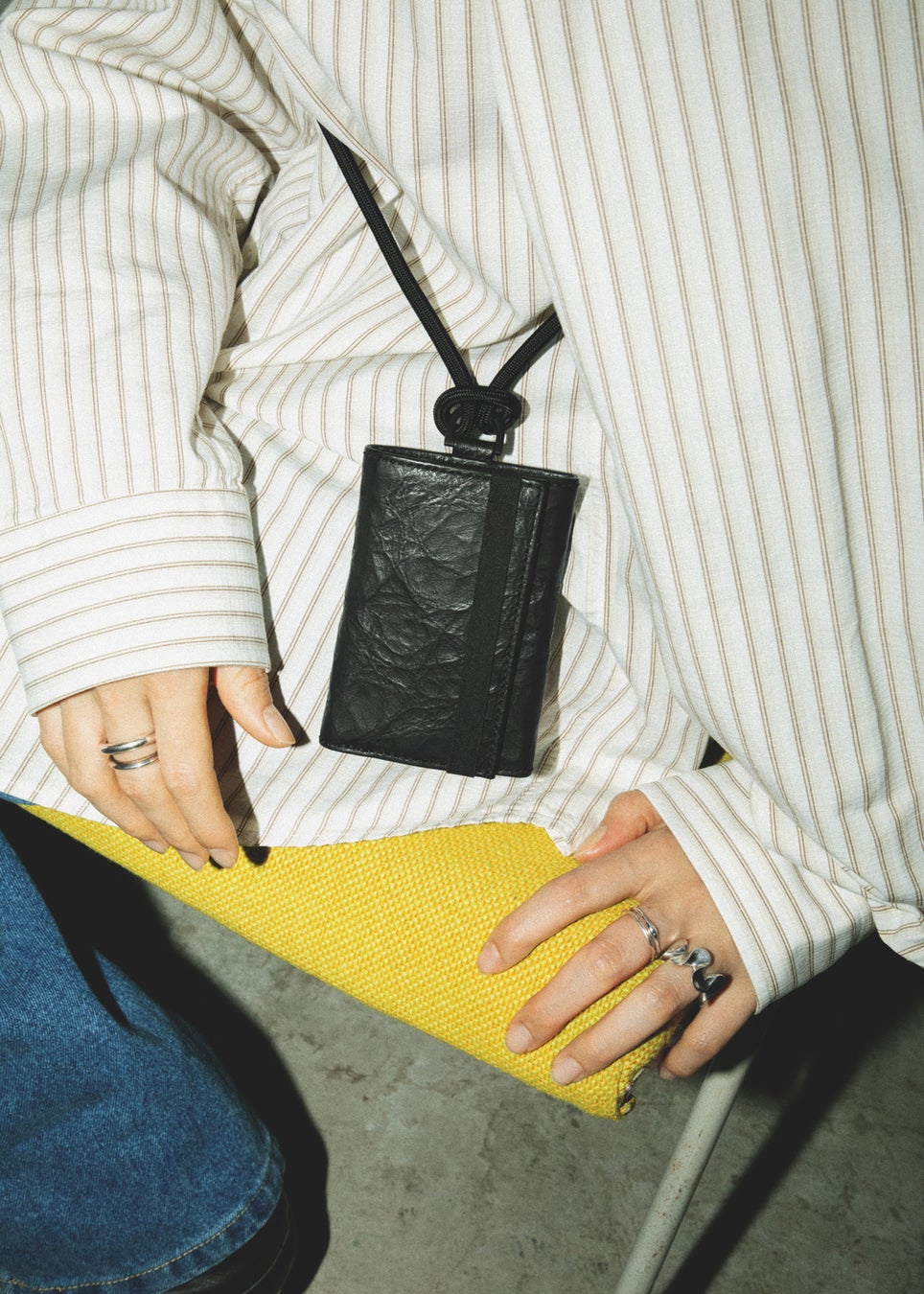紙幣、小銭、カード、鍵を収納でき、ショルダーストラップで軽快に持ち運ぶことができる手のひらサイズのミニウォレット。ショルダーストラップには安定感のある太めのナイロンコードを使用し、取り外し可能。