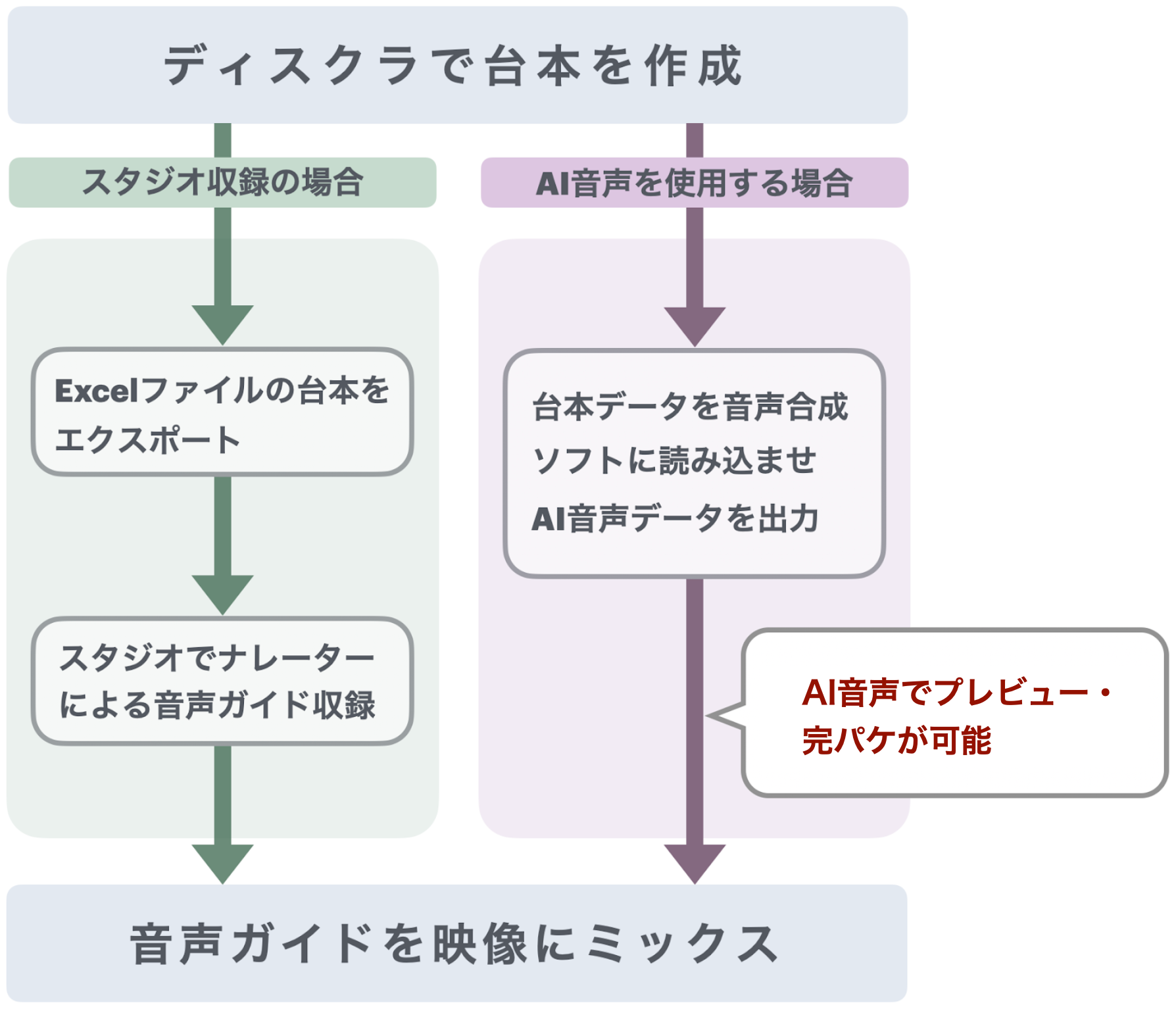 ディスクラから出力したデータを音声合成ソフト※1 に読み込ませ、AI音声による音声ガイドのデータを作成したのち、そのデータをディスクラに読み込ませることで即座にAI音声ガイド付きの映像を再生できます。ナレーターのキャスティングやスタジオ収録を省略することも可能です。