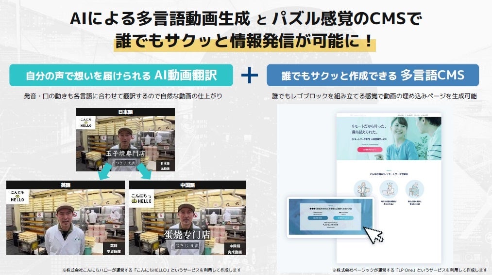 これらの課題を解決するために、『こんにちハロー』と『ベーシック』は共同でサービスを提供開始します。『こんにちハロー』の自分の声で想いを届けられるAI動画翻訳と、『ベーシック』の誰でもサクッと作成できる多言語CMSの組み合わせにより、多言語による動画コンテンツやホームページの提供を簡単に実現できるようになります。外国人観光客や顧客に対して、多言語で自社のサービスや商品を効果的にアピールすることが可能になることで、課題が解消され、事業者がそれぞれの強みを発揮し、固有の価値を生むための仕事に専念できる世界の実現を目指してまいります。