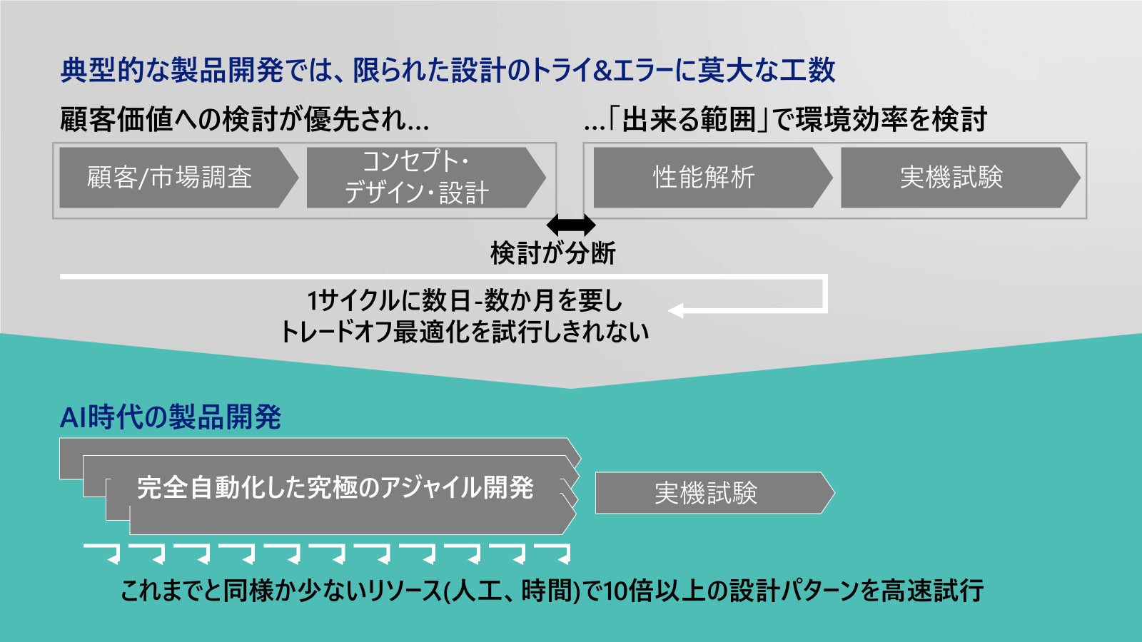 そこで、当社が強みとするCFD・物理シミュレーション高速化・3Dデザイン生成を融合させた革新的なソリューションを提供することで、設計開発プロセスにパラダイムシフトをもたらします。まず、高精度のCFD解析(相変化を伴う二相流解析を含む) を代替するサロゲートモデルを構築し、シミュレーションを大幅に高速化します。さらに、3Dデザイン生成技術を活用することで膨大な数のデザイン案を自動生成し、それに対して高速かつ効率的にシミュレーションを実行します。これにより、コンピュータ上でアジャイルに有望なデザインを見出す数値実験が可能となります。そのため、当社のソリューションは、限られた設計期間内で、これまでにない数のデザインを試行し、熱や流体に関する性能が優れた製品案の当たり付を高速に行うことができるので、顧客の設計開発プロセスのスピードと質を飛躍的に向上させることができます。