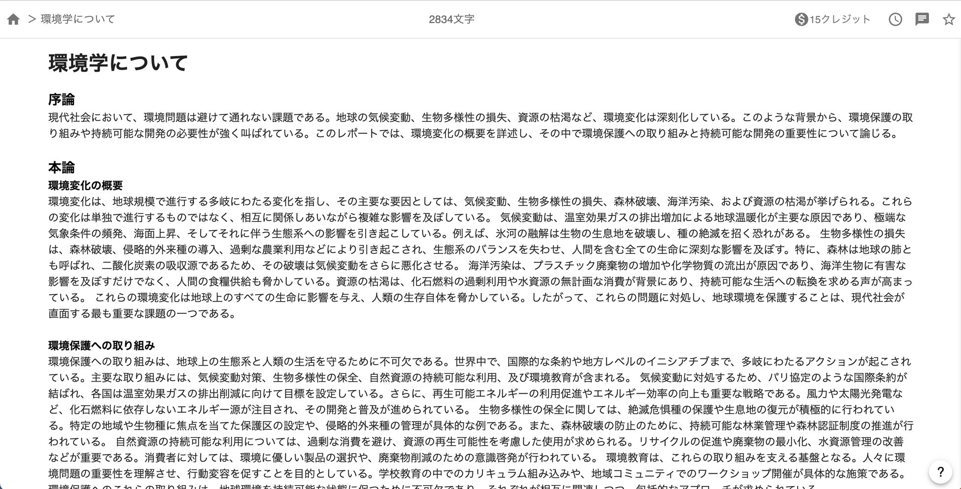 3000文字以上の長文の出力にも対応しております。もし、文字数を増やして出力させたい場合は、先ほどの画面で目次を増やすと出力されるレポートの文字数も増やすことが可能です。