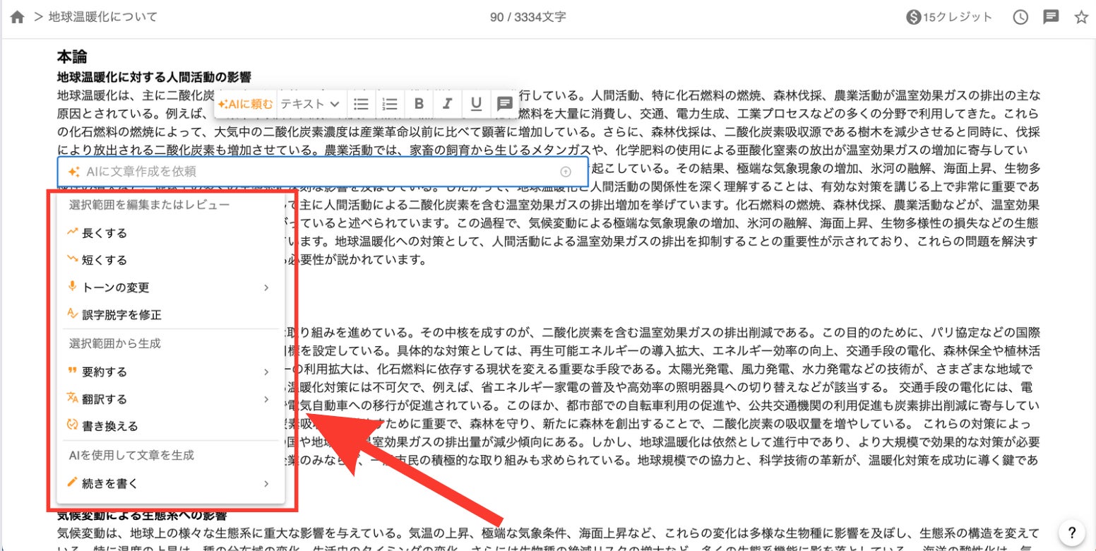 既存の未完成のレポートの完成度に不安がある方は、文章を範囲指定して、こちらのAI編集機能で高得点が取れるレポートを作成することが可能になります。