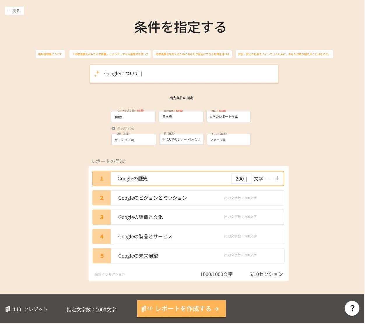 こちらの目次を増やせば増やすほど、作成されるレポートの文字数が多くなります。