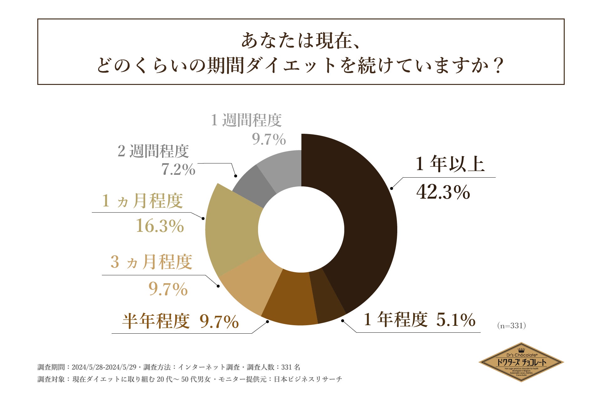まず「現在、どのくらいの期間ダイエットを続けているか」を問う設問への回答で最も多かったのは「1年以上」で42.3%となりました。この結果から、1年以上の長期に渡ってダイエットに取り組んでいる方が比較的多いと明らかになりました。