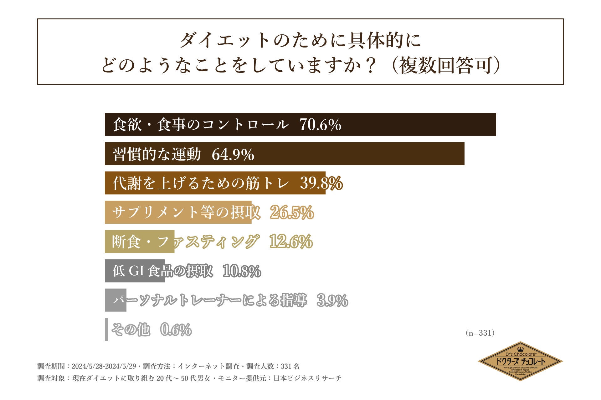 次に「ダイエットのために具体的にどのようなことをしているか」を尋ねる設問への回答で多かったのは、1位「食欲・食事のコントロール」で70.6%、2位「習慣的な運動」で64.9%となりました。この2つの回答のみ回答率50%を超え、ダイエットでは、主に「食事のコントロール」と「運動」に取り組む方が多いという状況が明らかになりました。